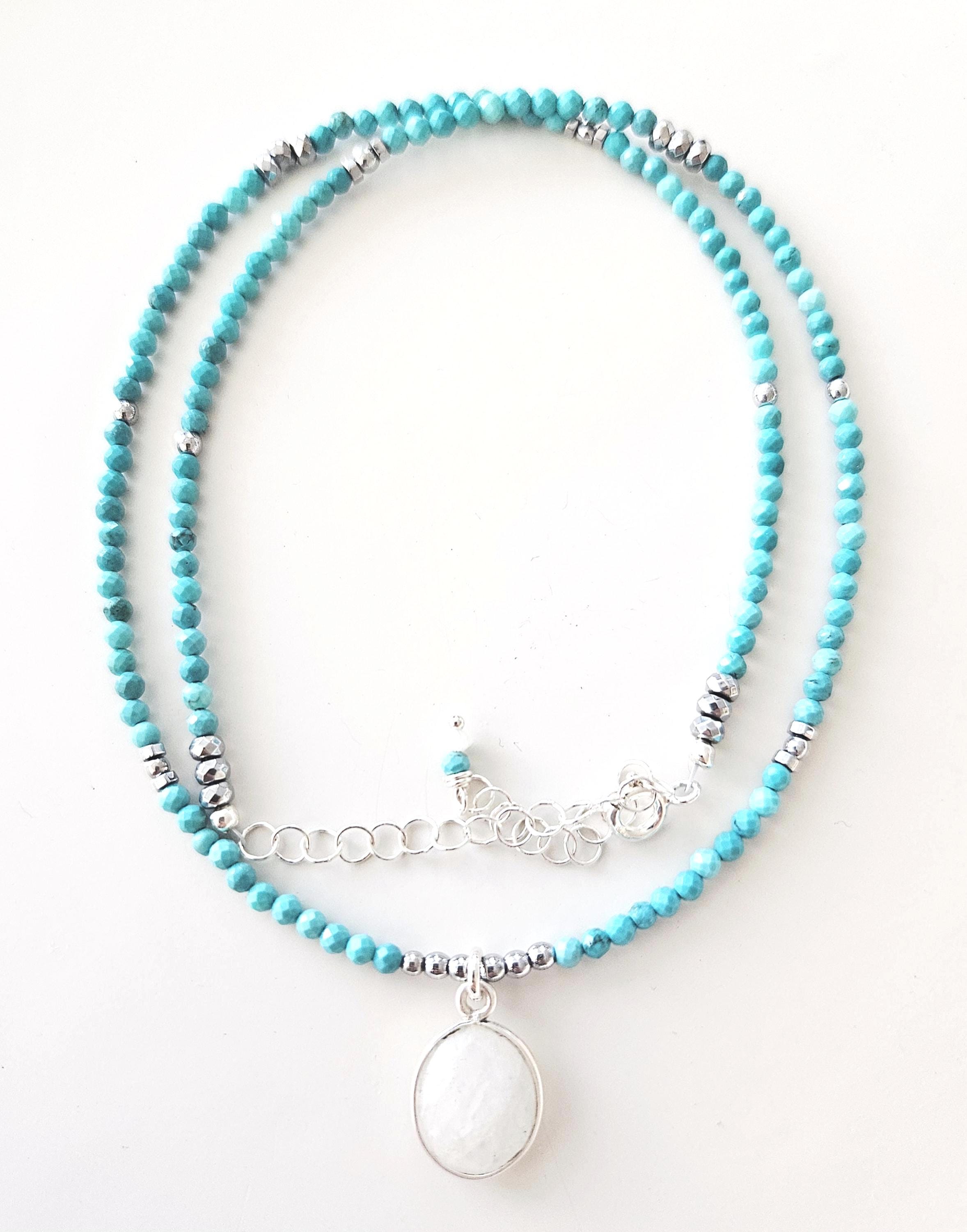 • • Moonstone Pendant & Turquoise Beaded Necklace • •