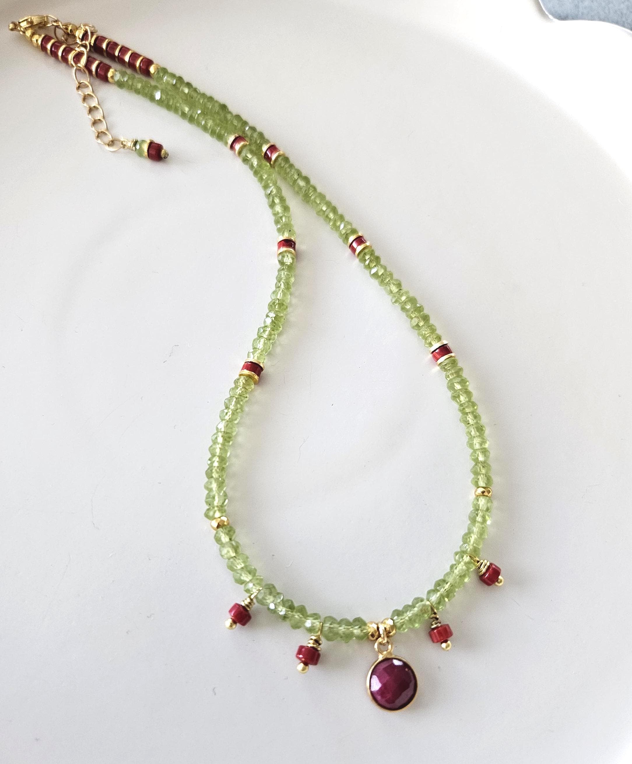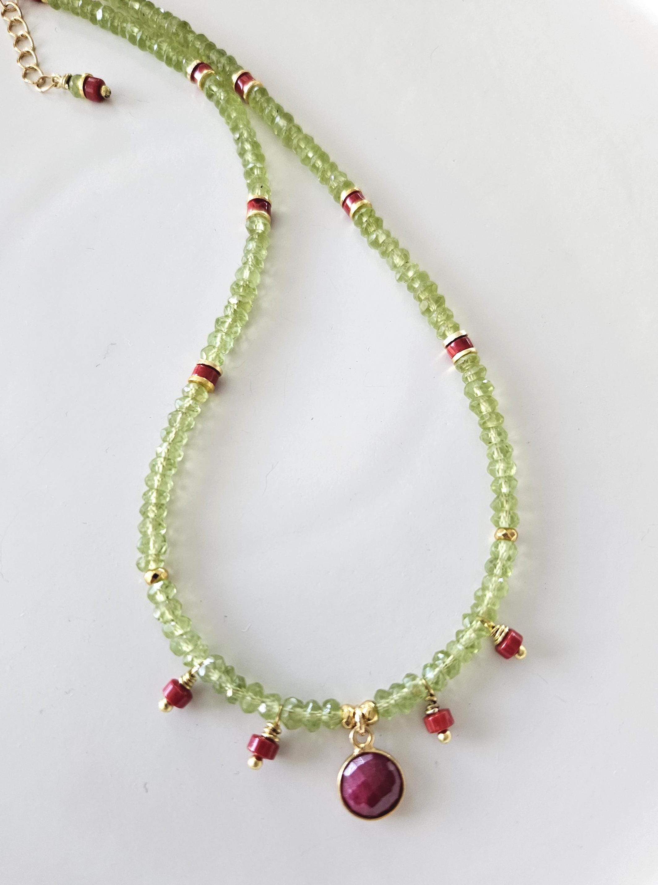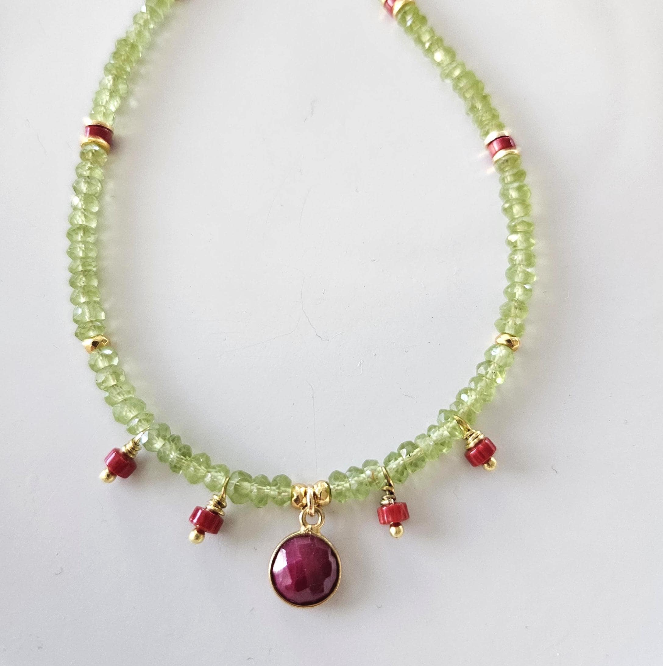 • * • Ruby Pendant with Peridot and Coral Beaded Necklace • * •