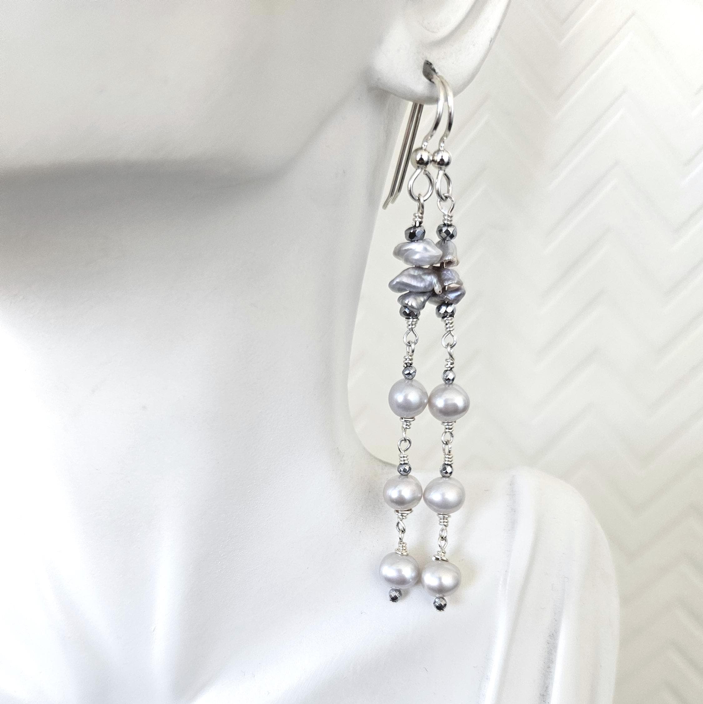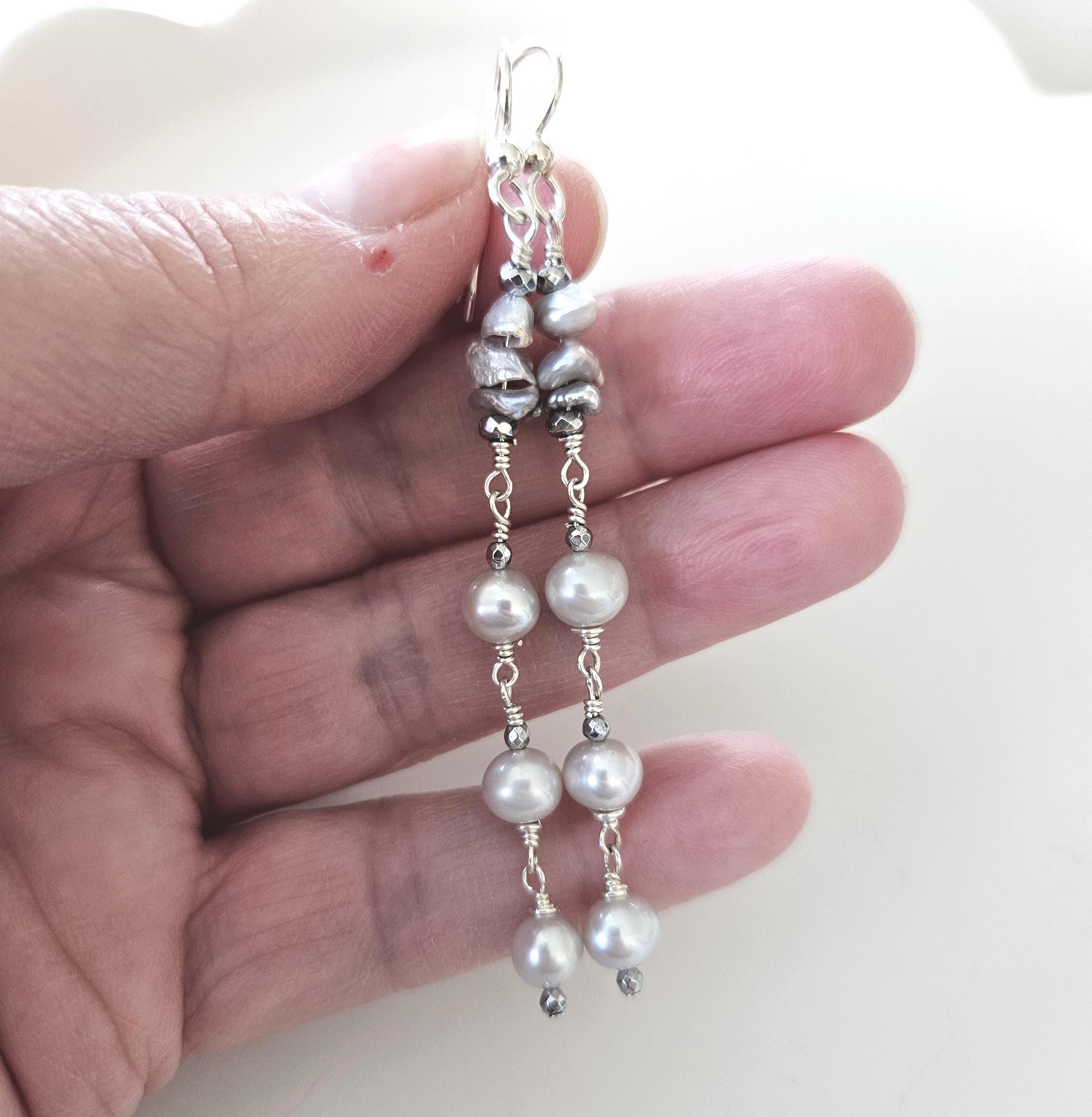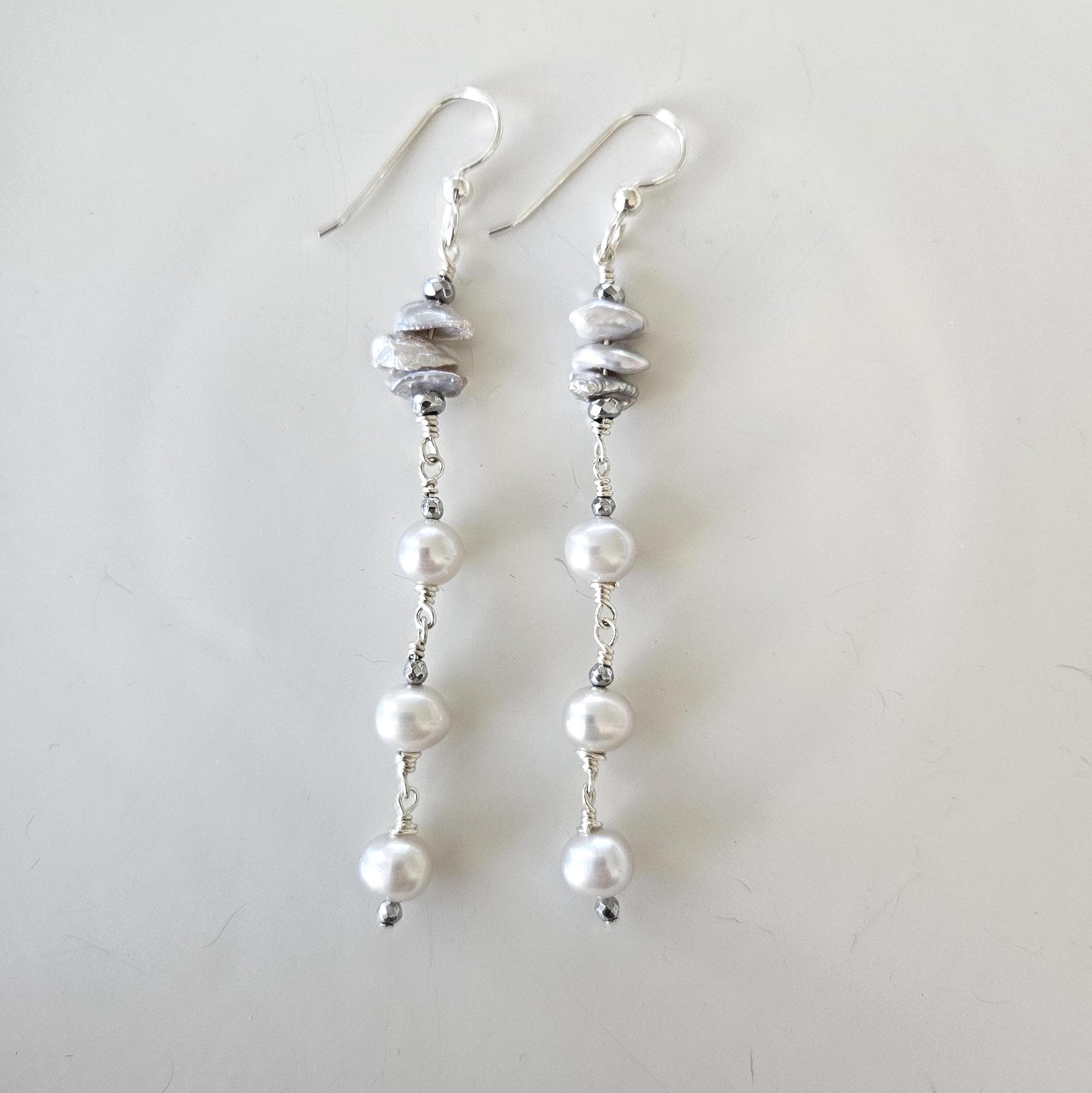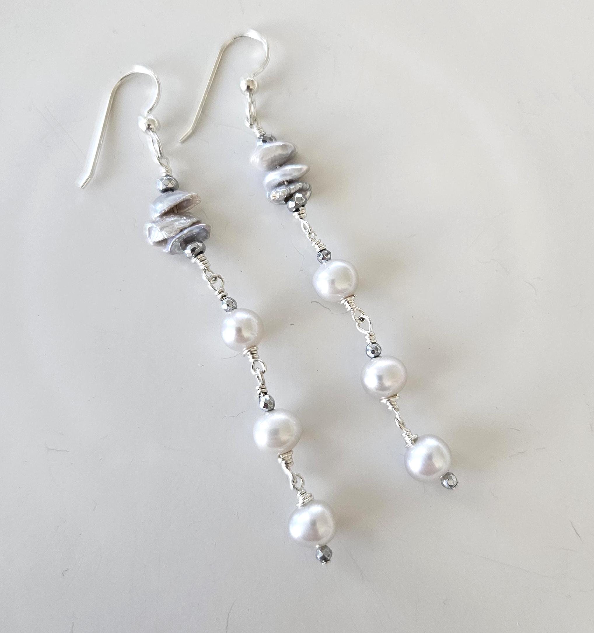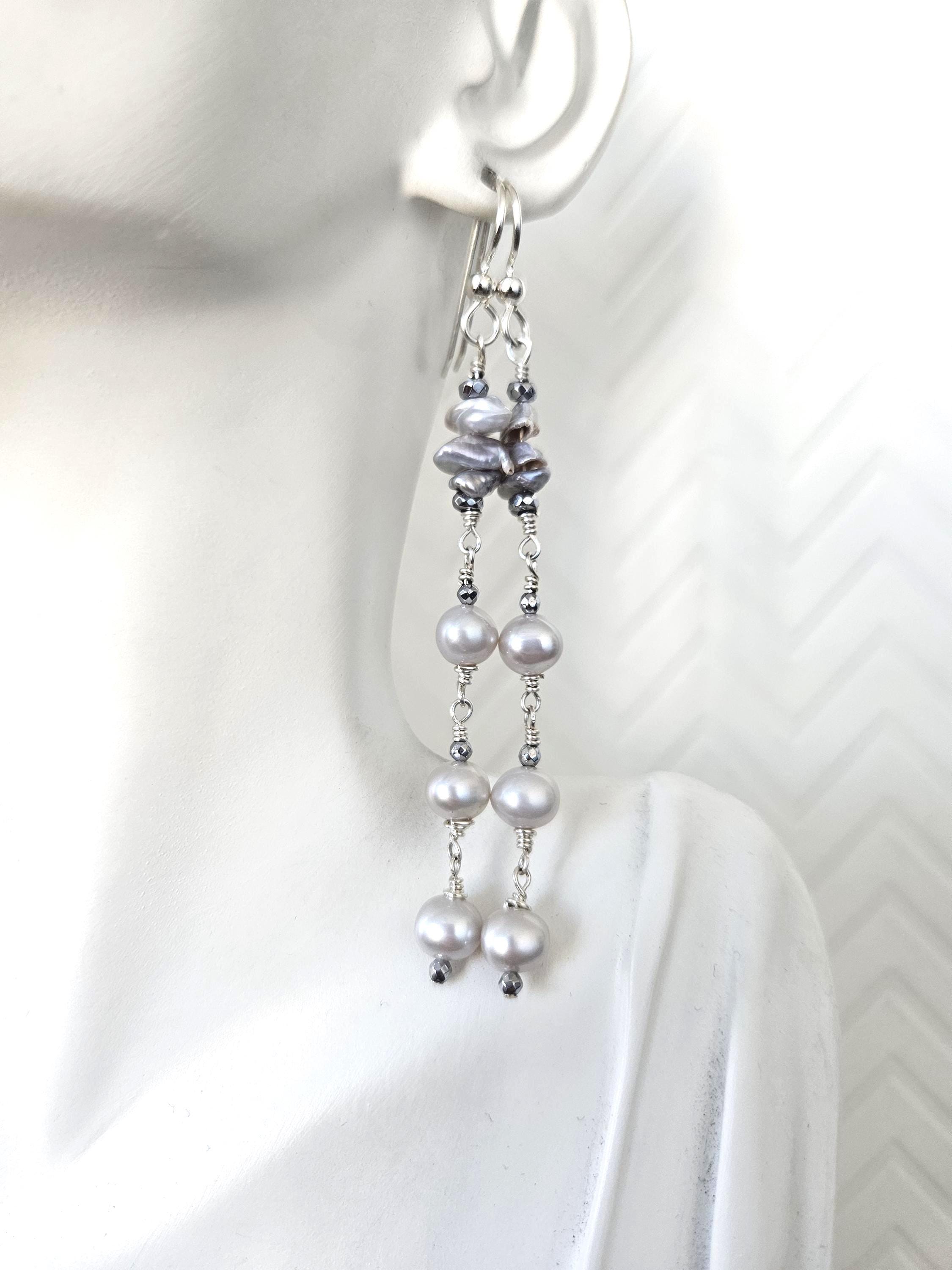 • * • Keshi Pearls & Gray Potato Pearls Drop Earrings • * •