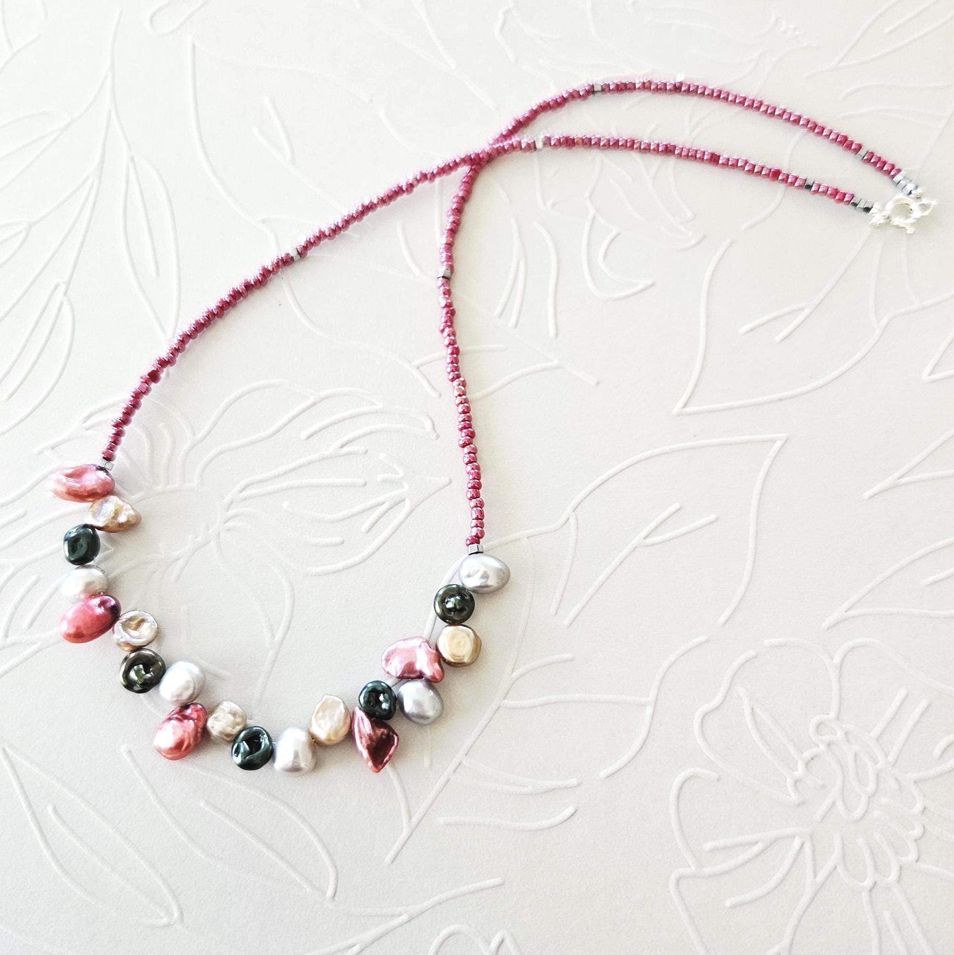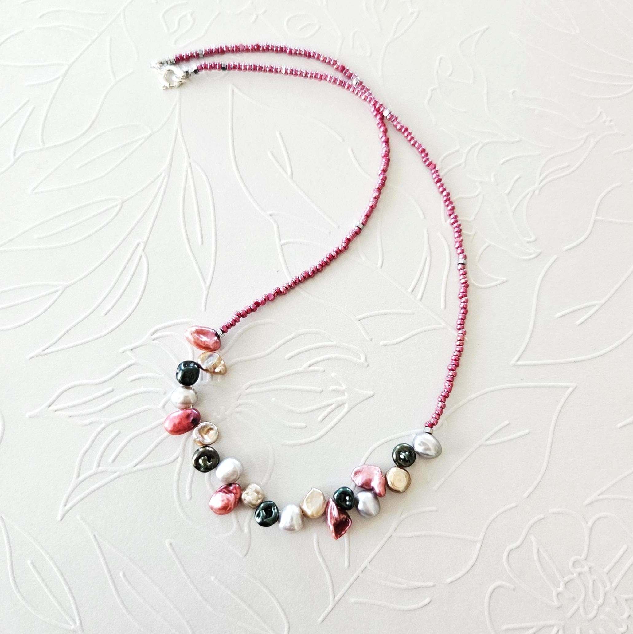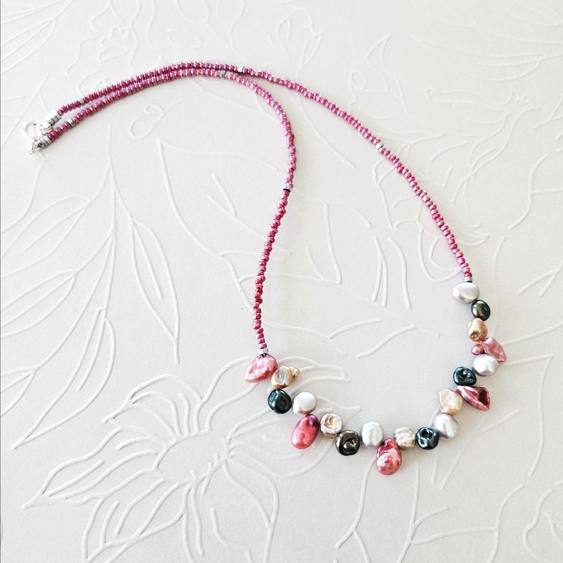 ~ ♦ ~ Colorful Keshi Pearl Necklace with Fuchsia Pink Czech Beads ~ ♦ ~