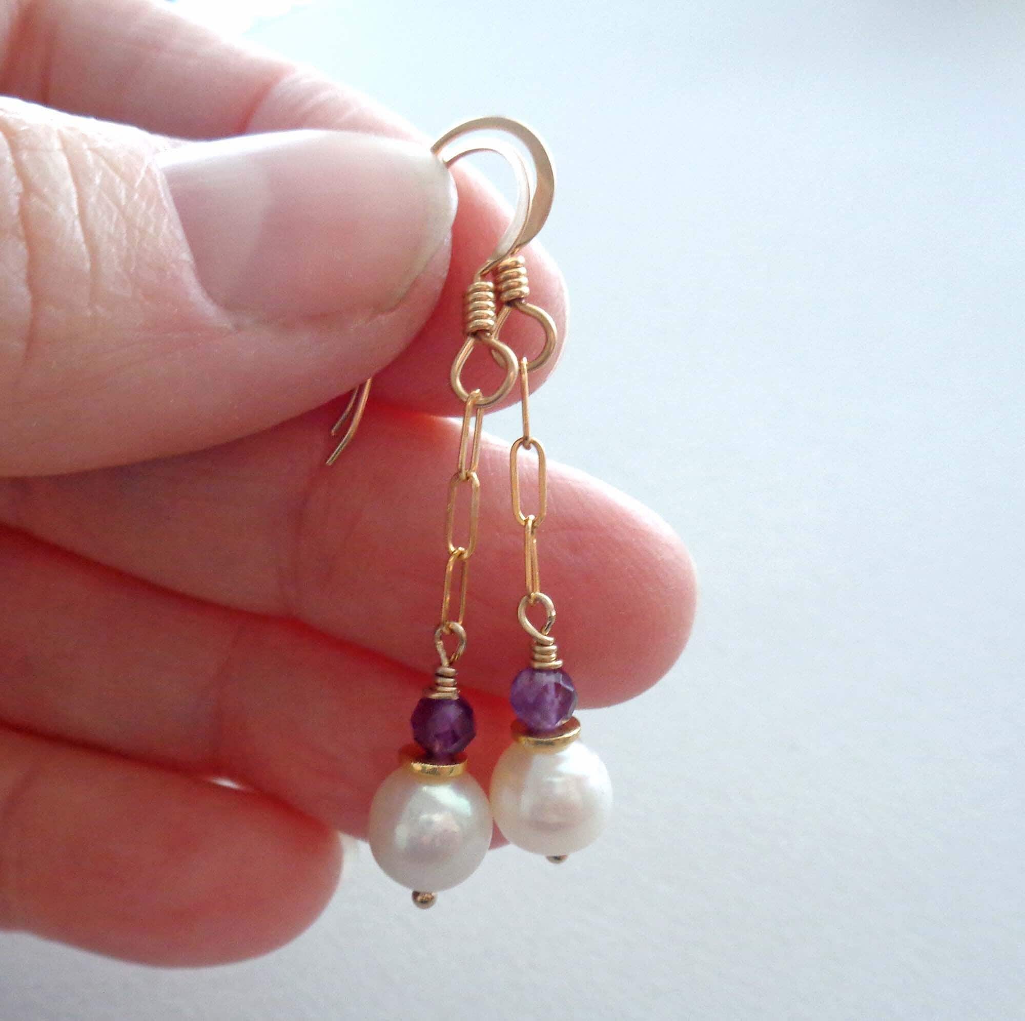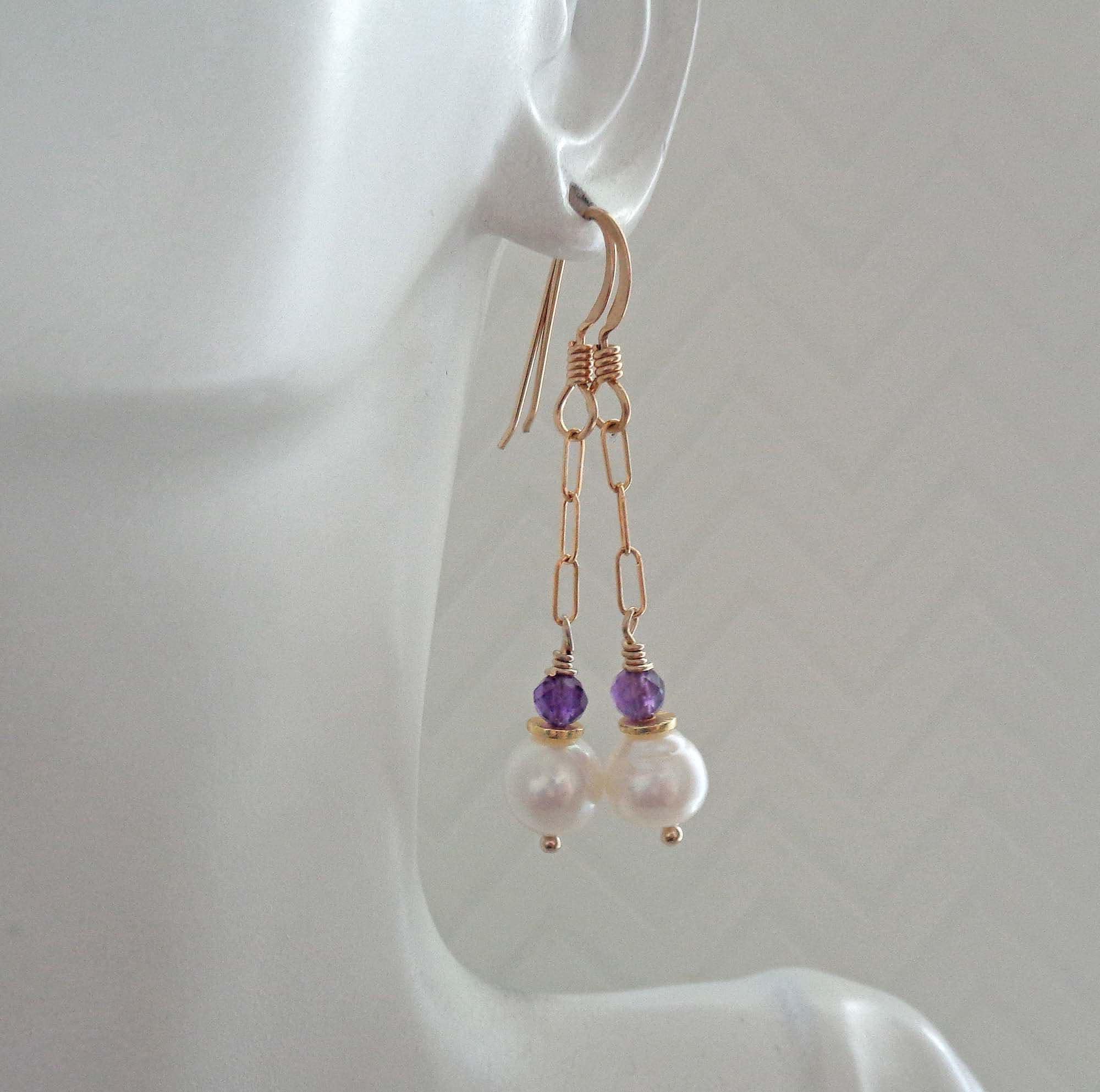 • * • Elegant Amethyst & White Pearl Drop Earrings • * •