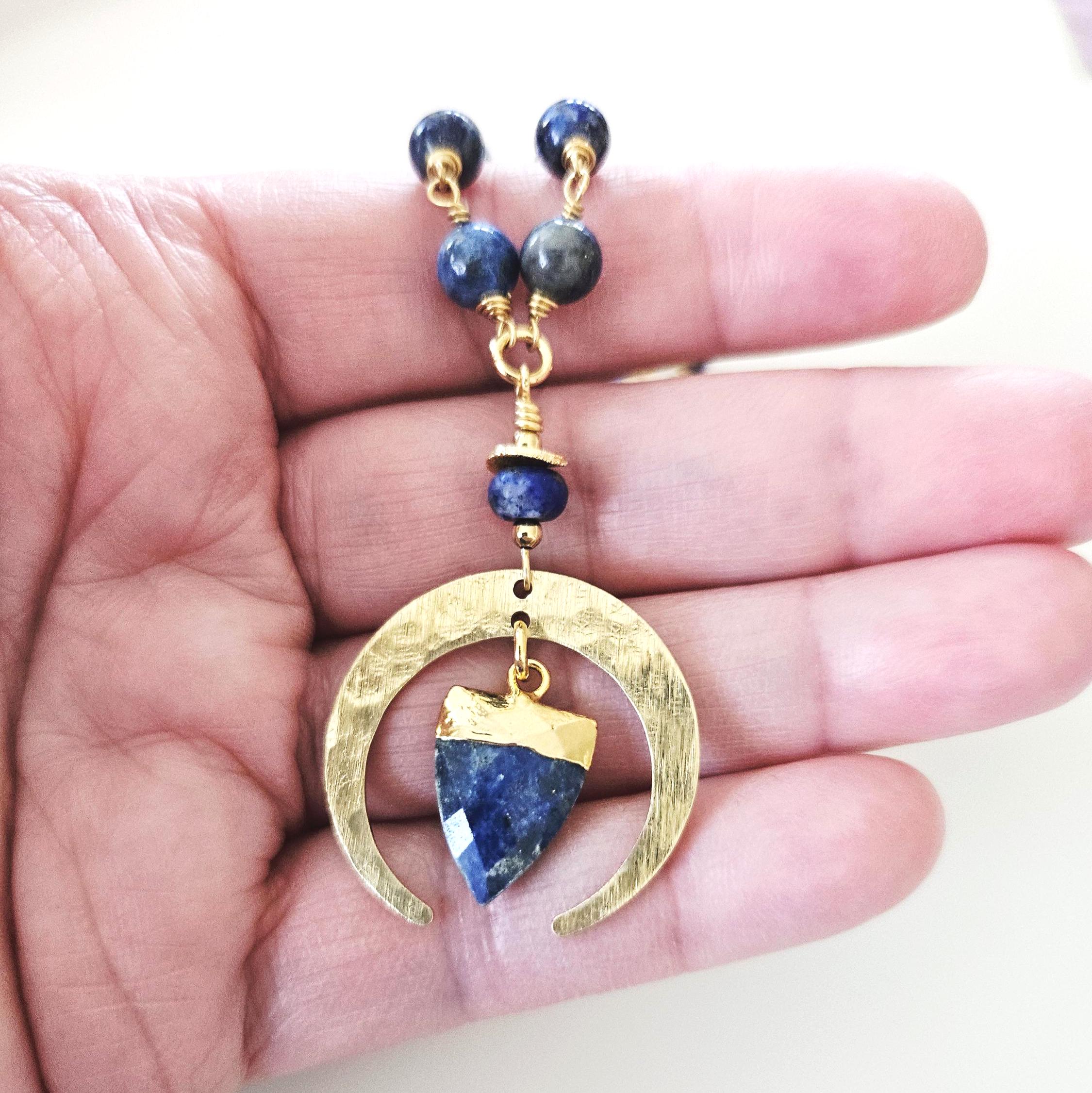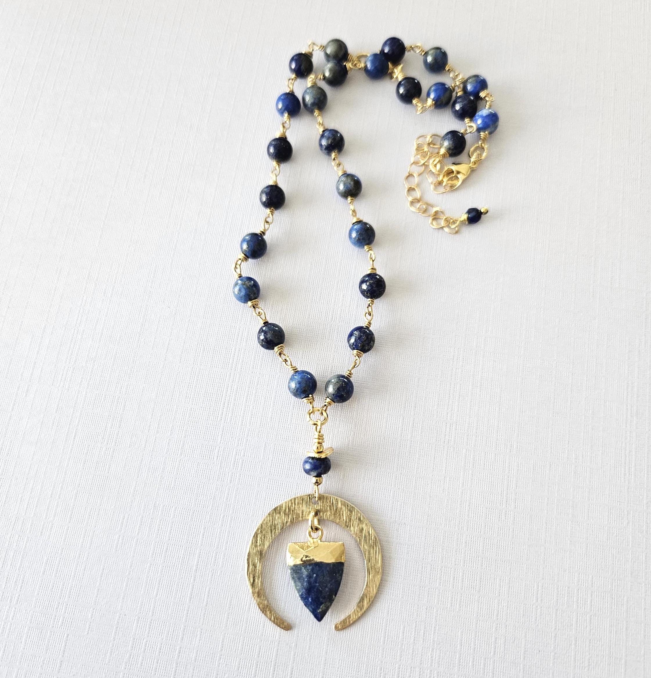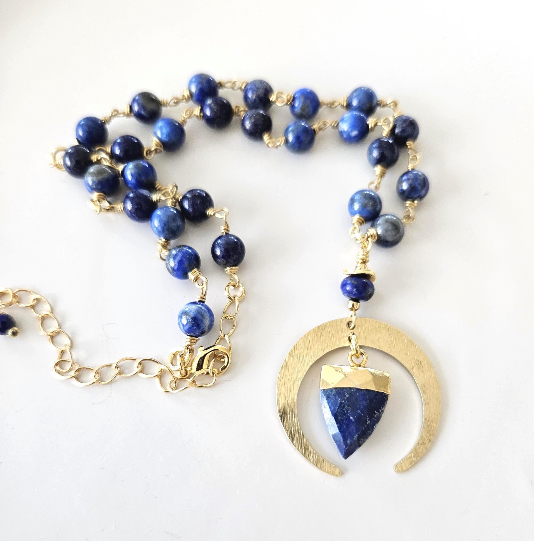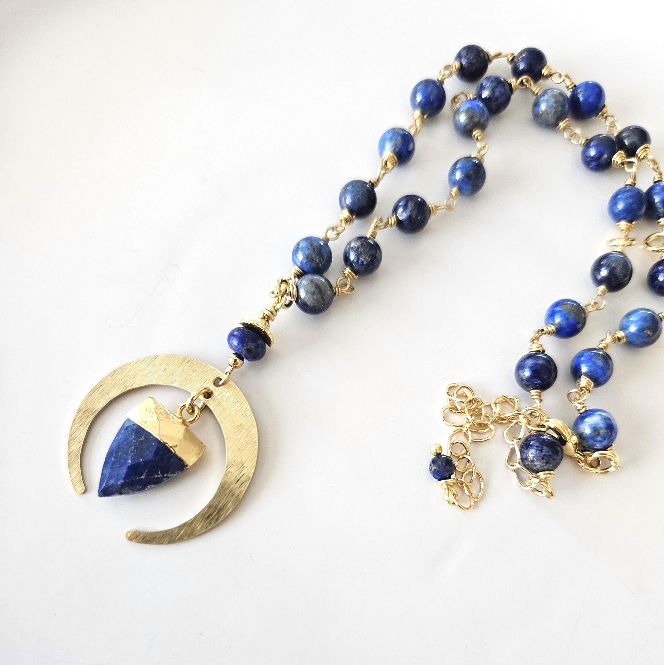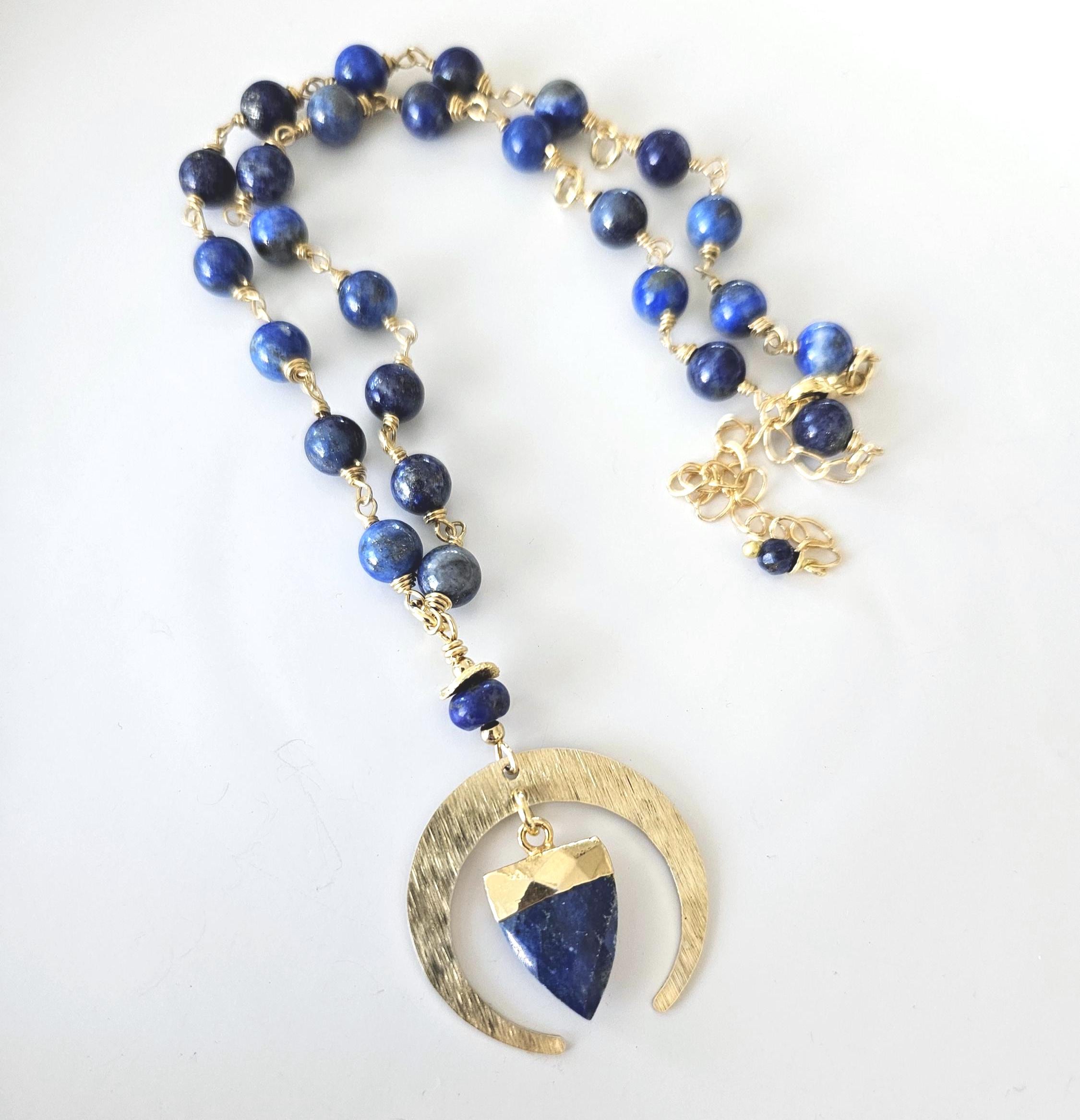 ~ ♦ ~ Moon Pendant and Lapis Lazuli Wire-wrapped Necklace ~ ♦ ~