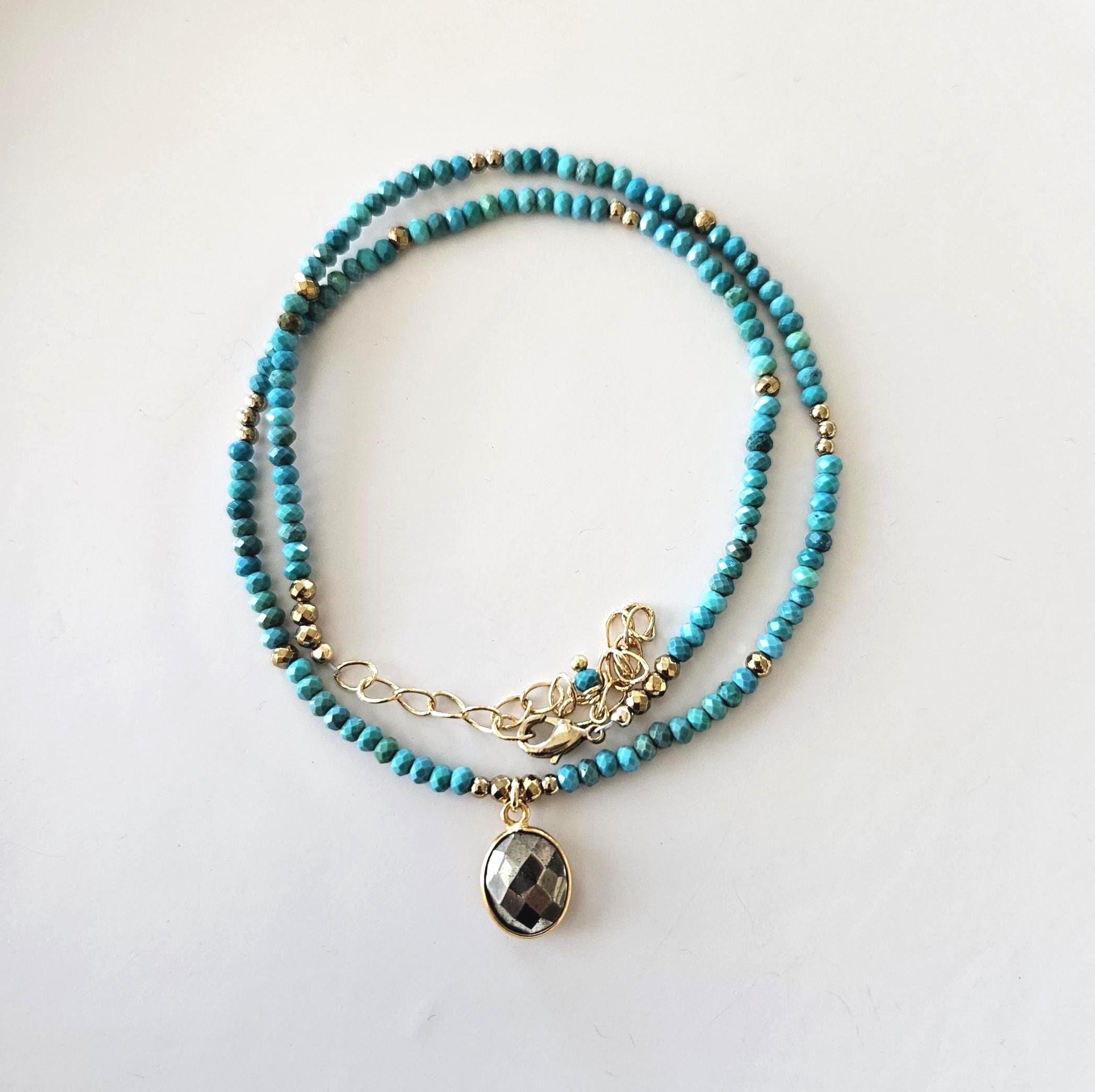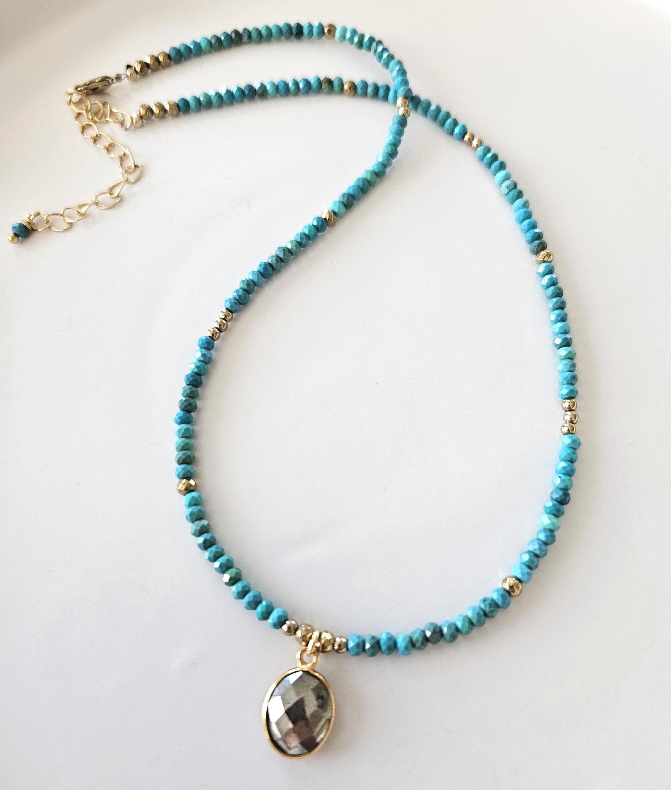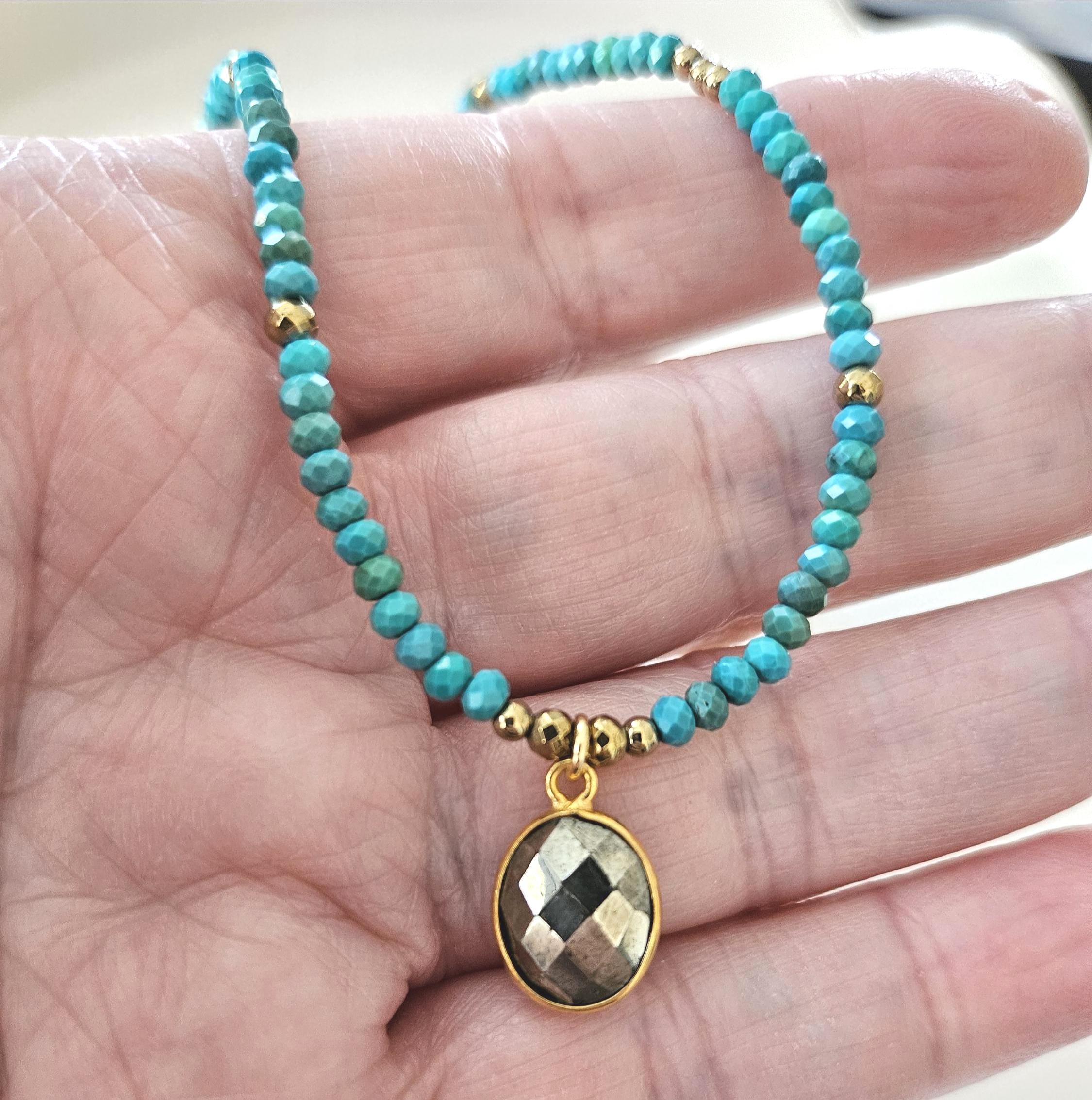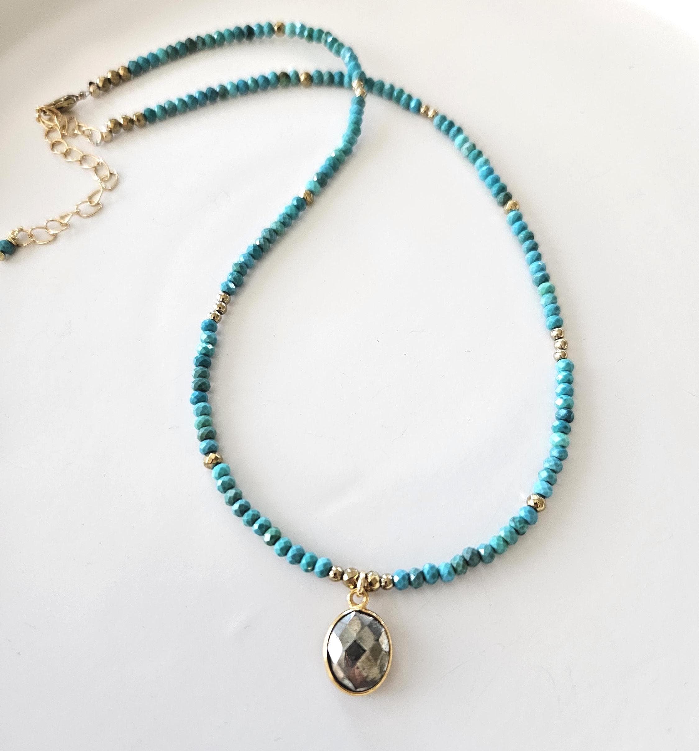 • • Dainty Turquoise & Pyrite Beaded Necklace • •