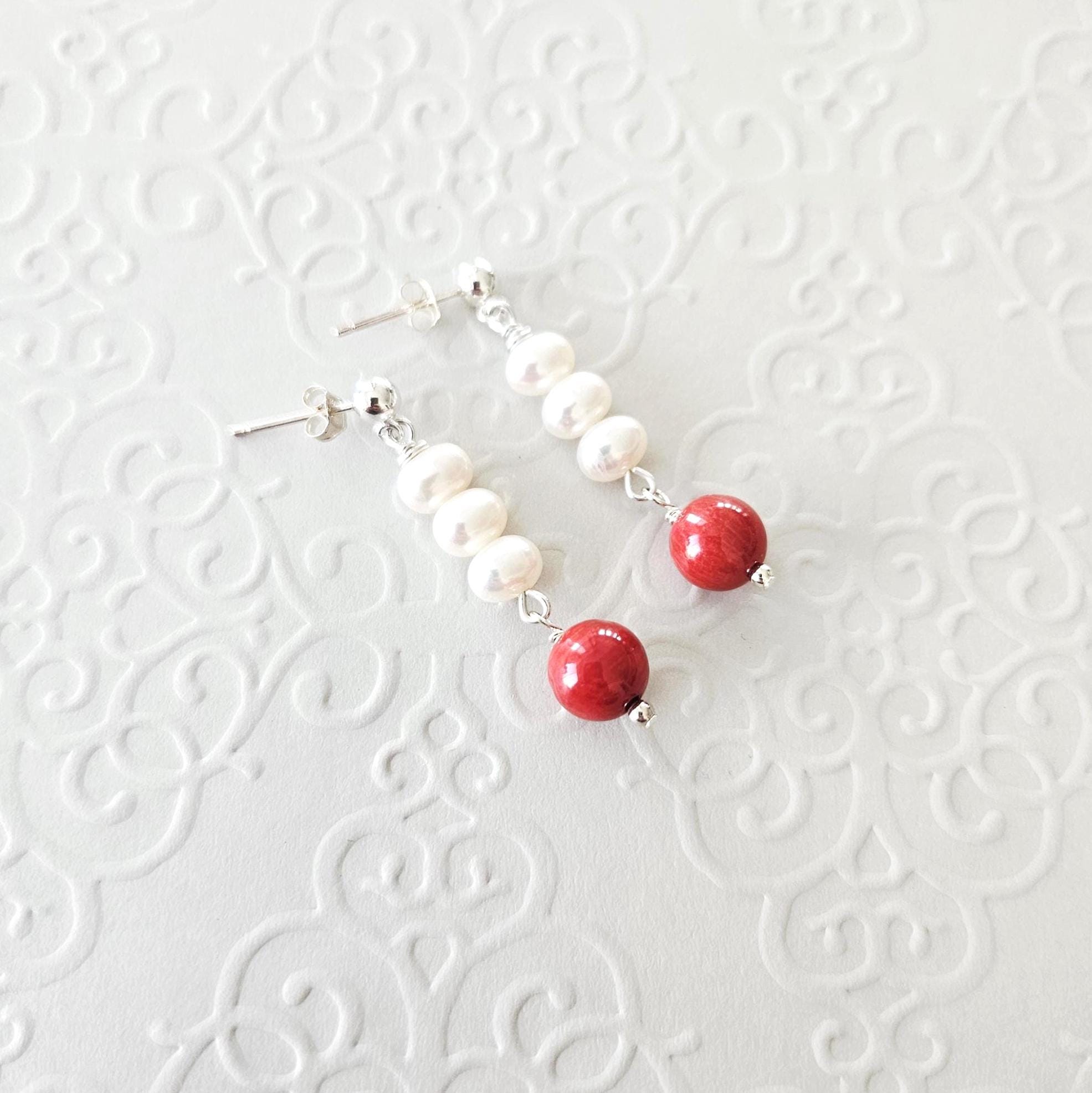 • * • Elegant Pearl and Coral Drop Earrings • * •