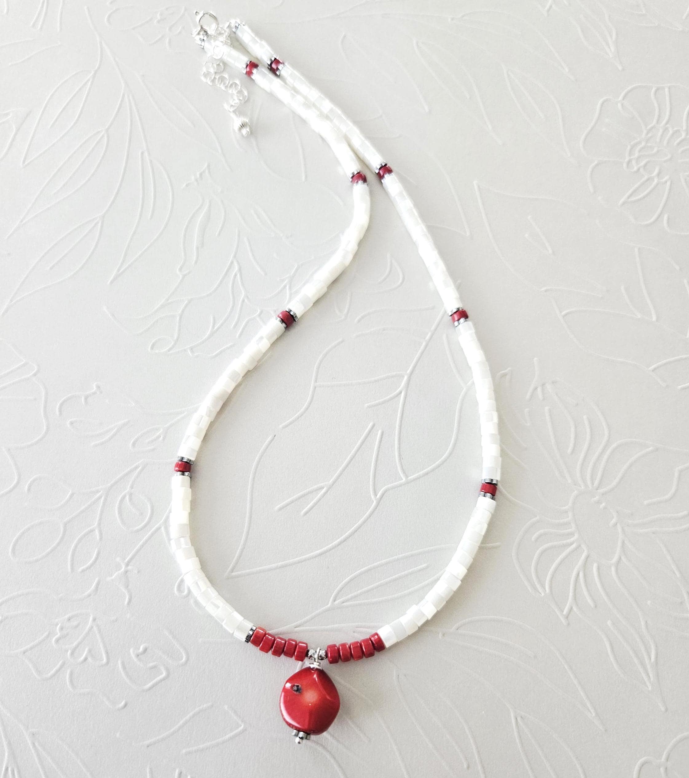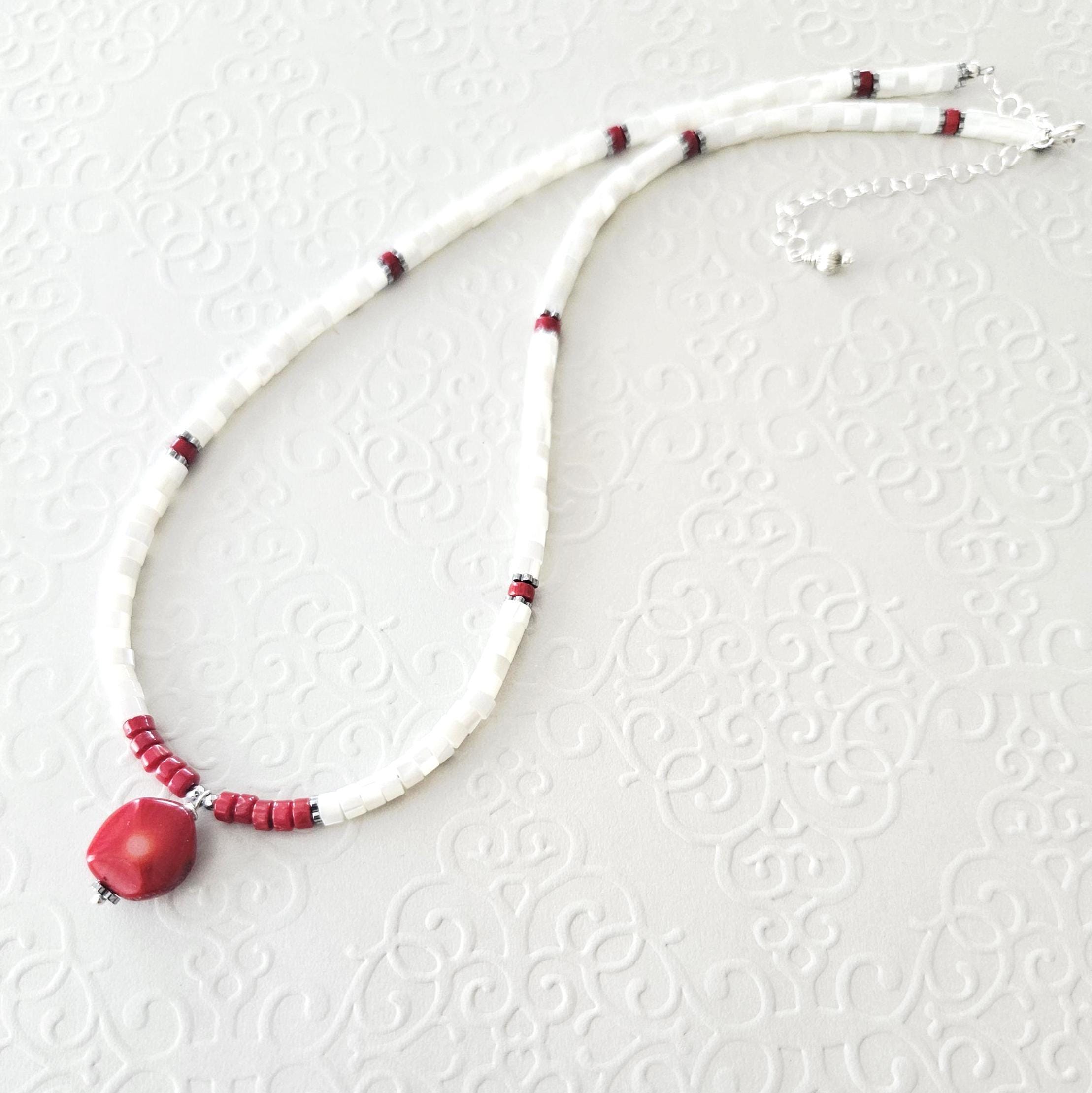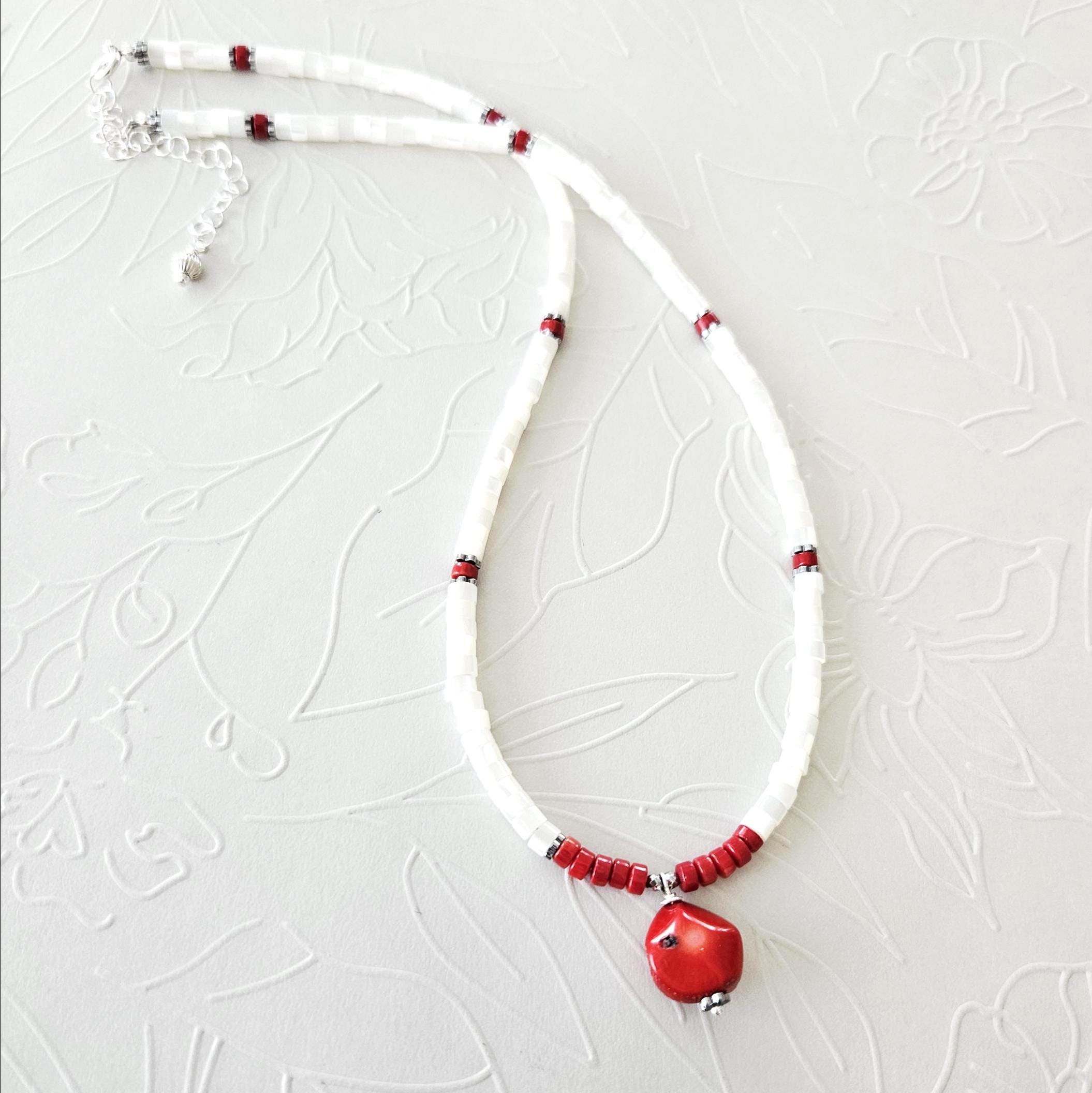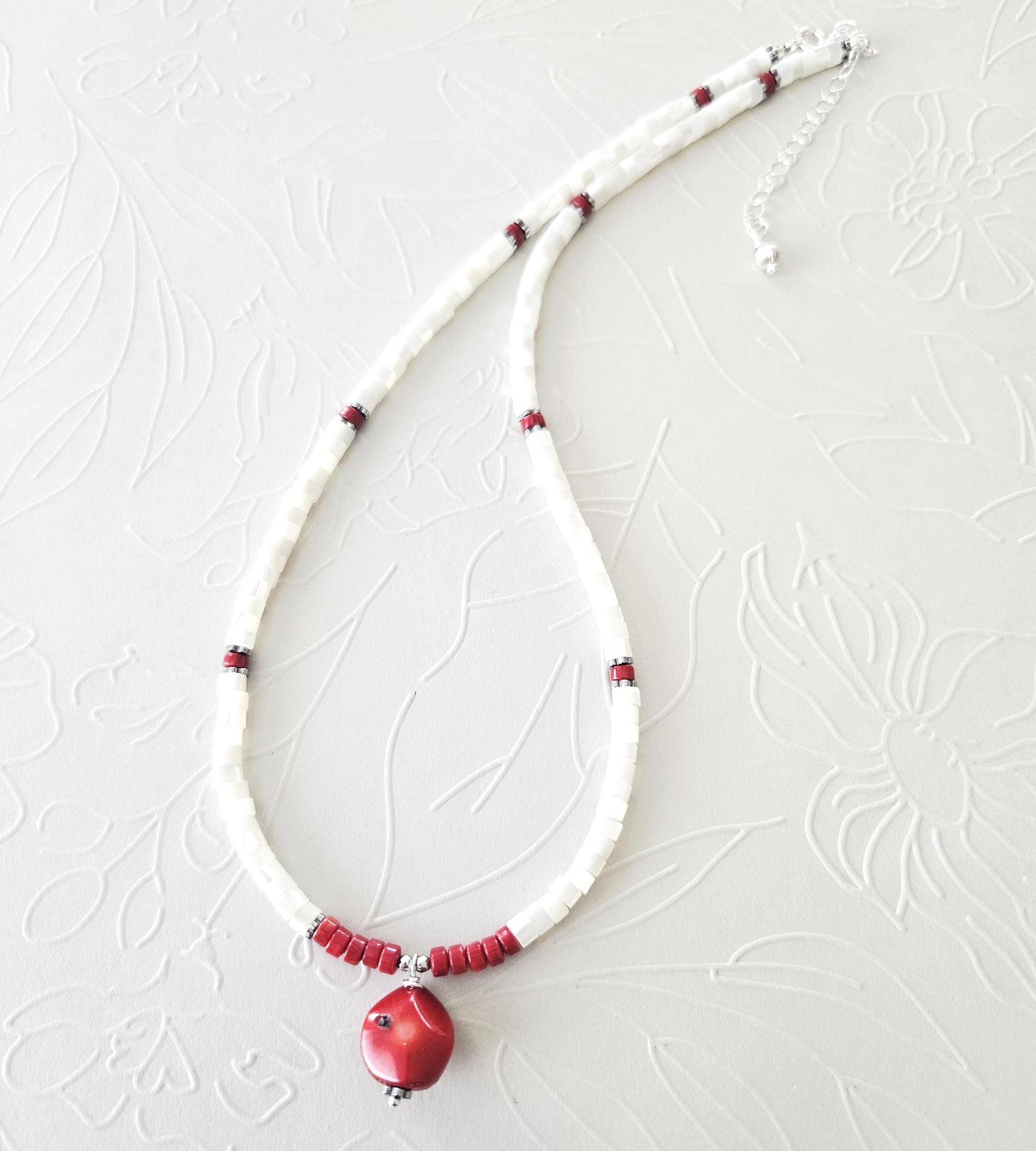 • • Mother of Pearl & Coral Pendant Beaded Necklace • •