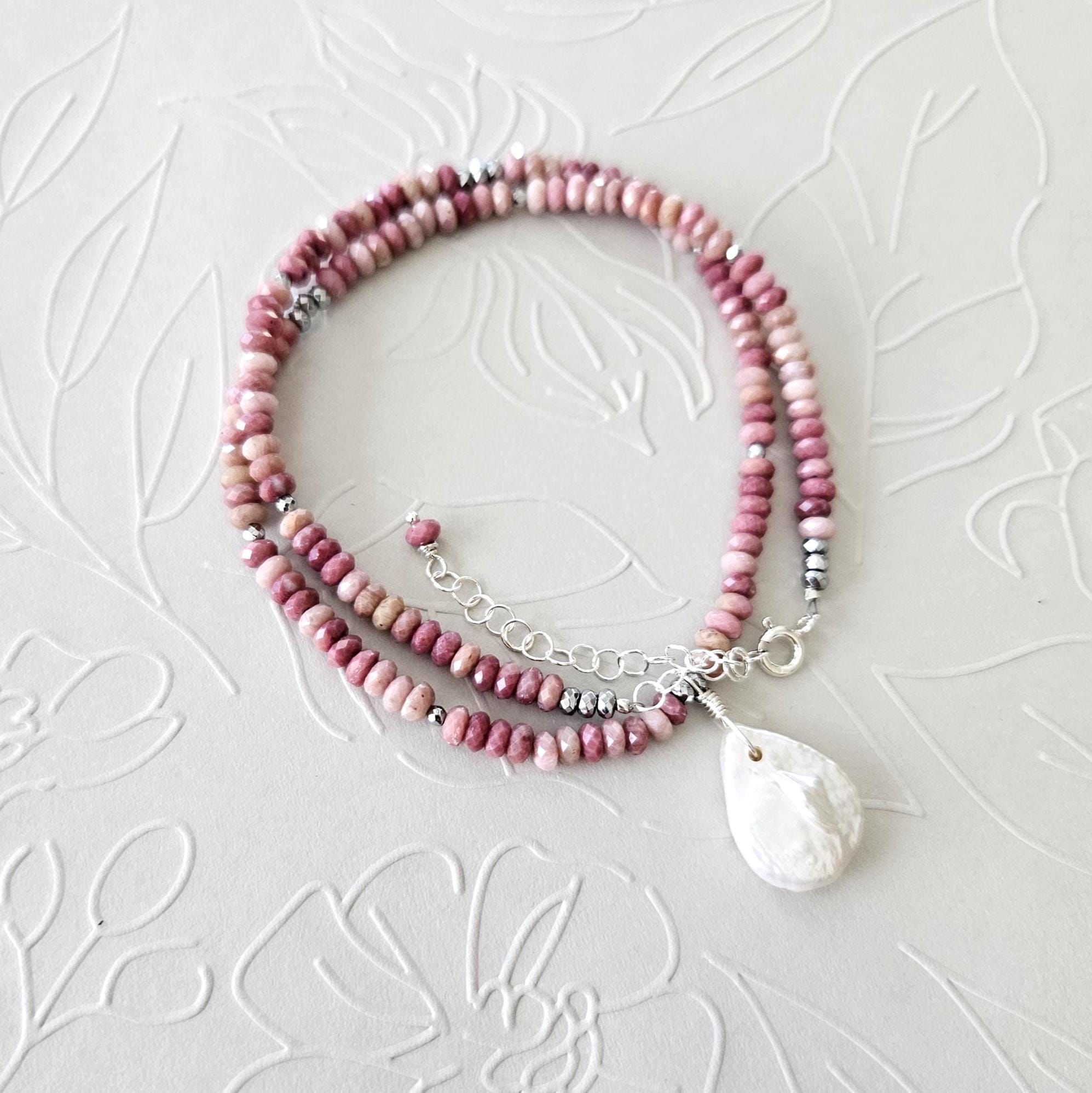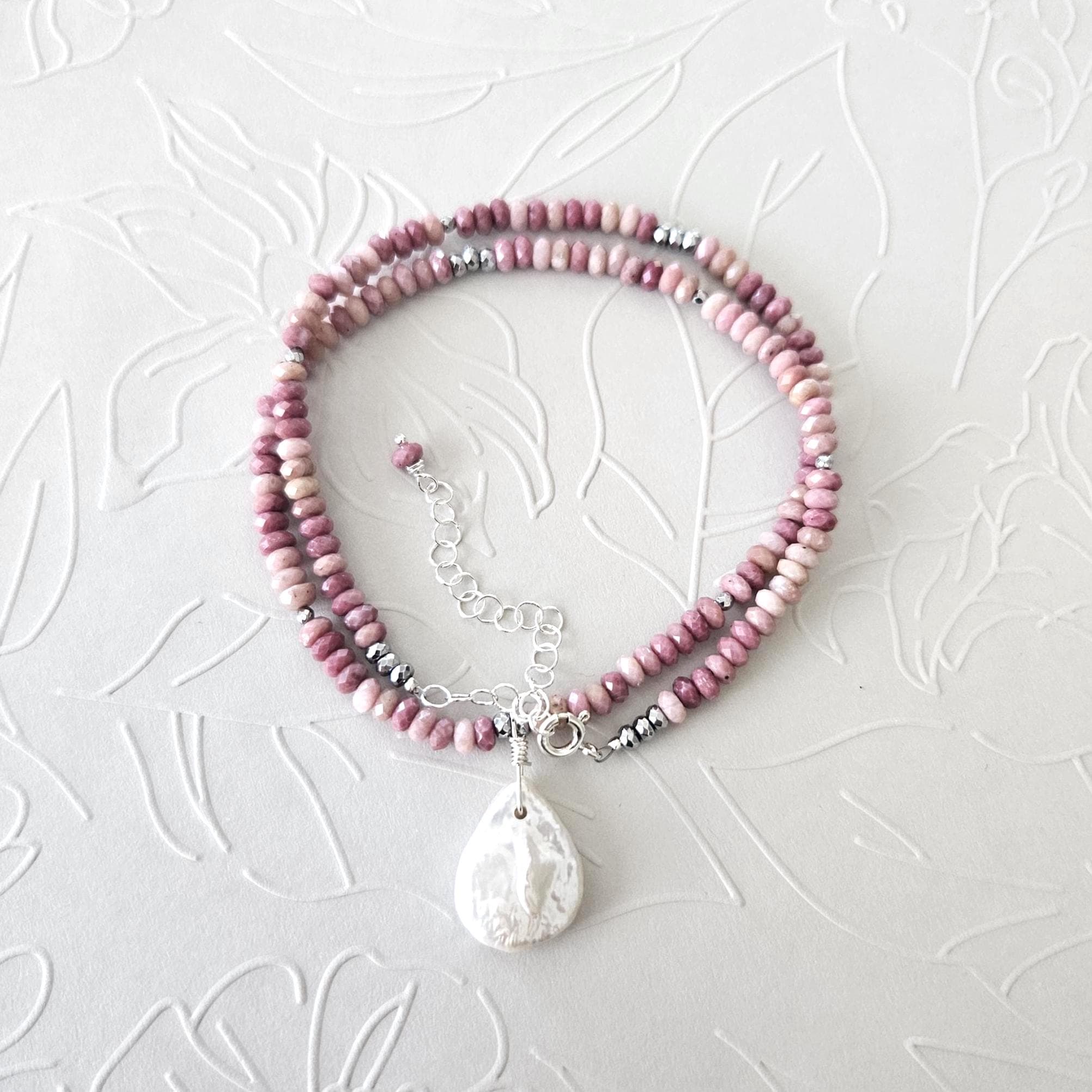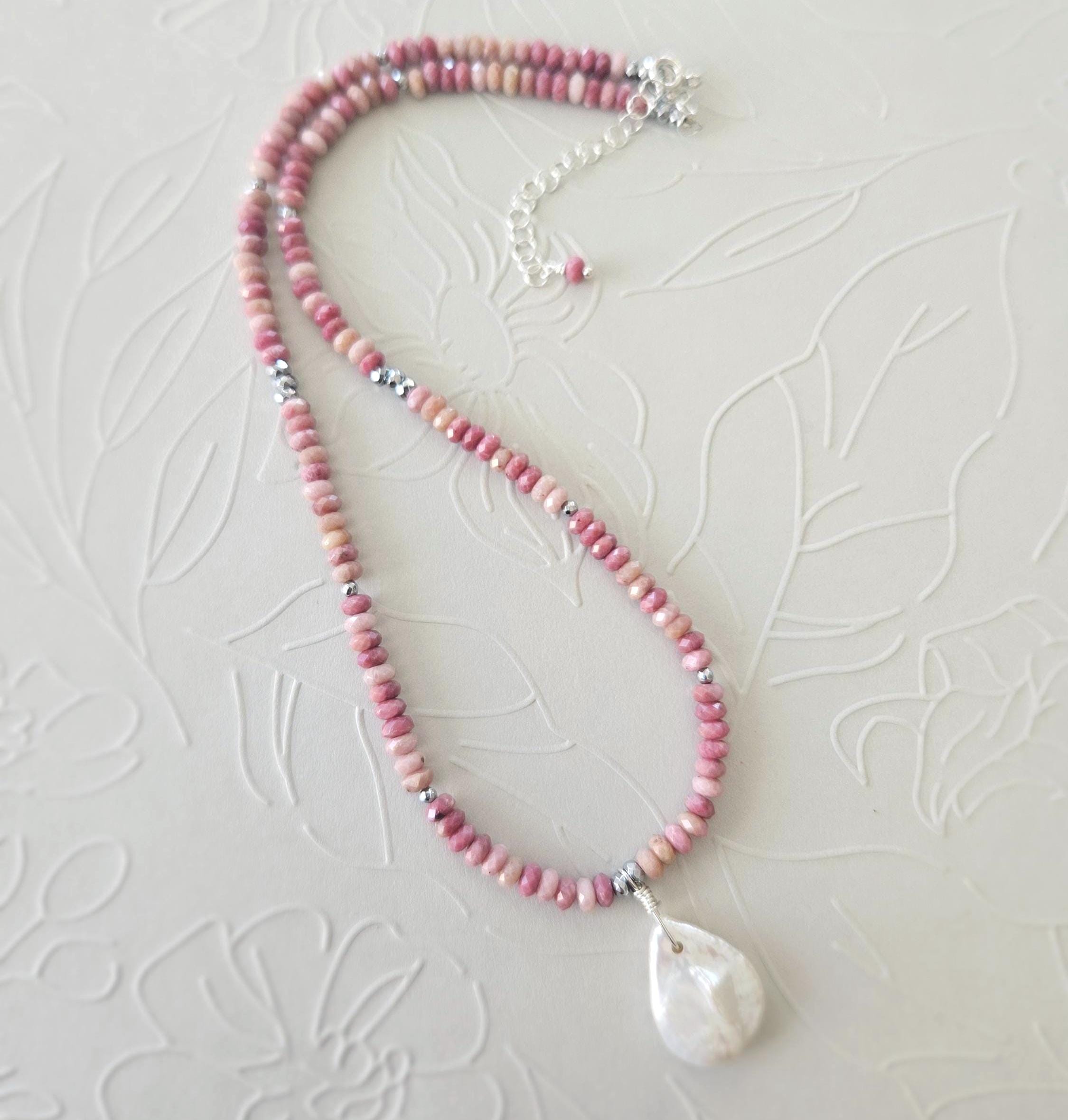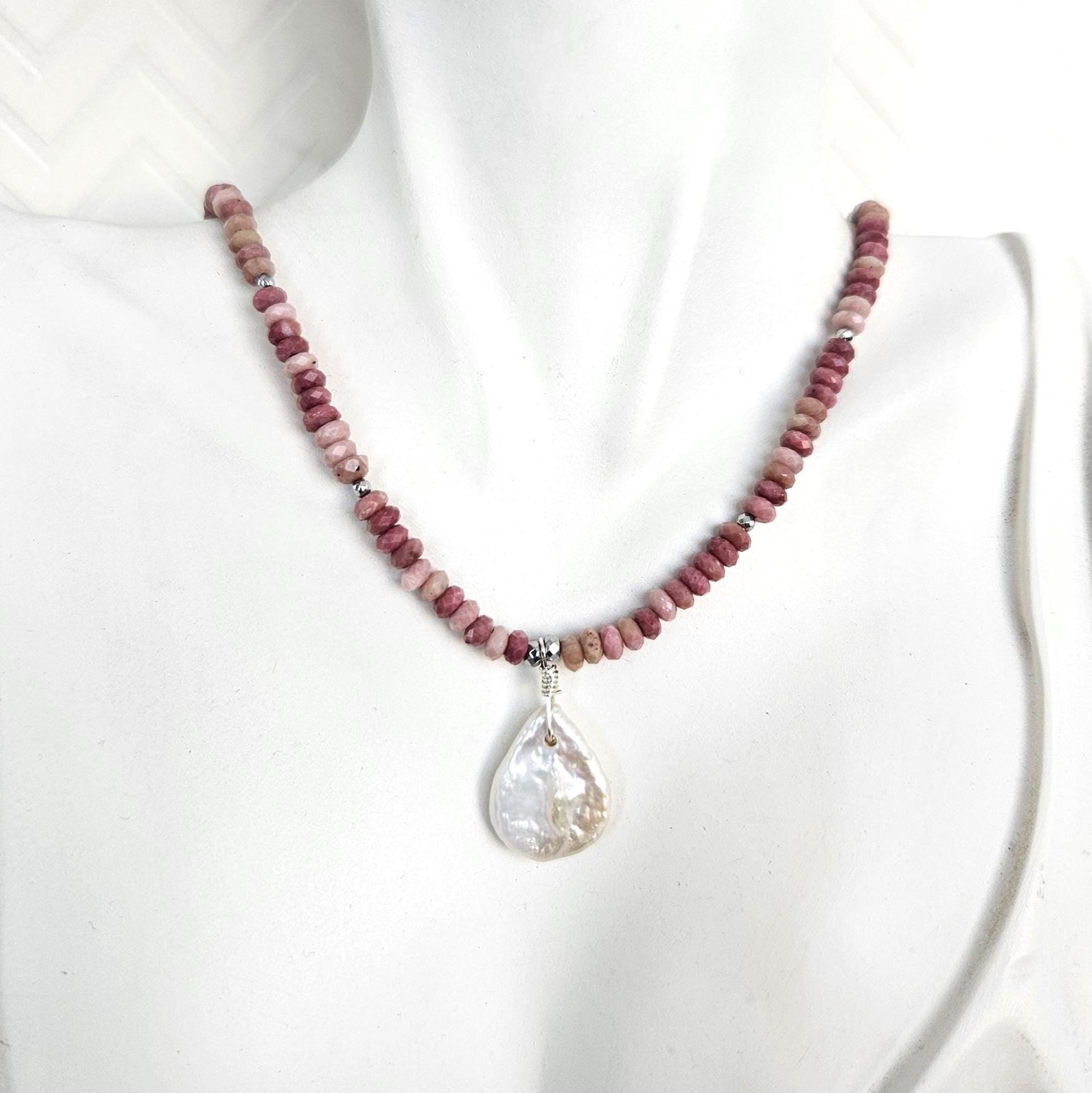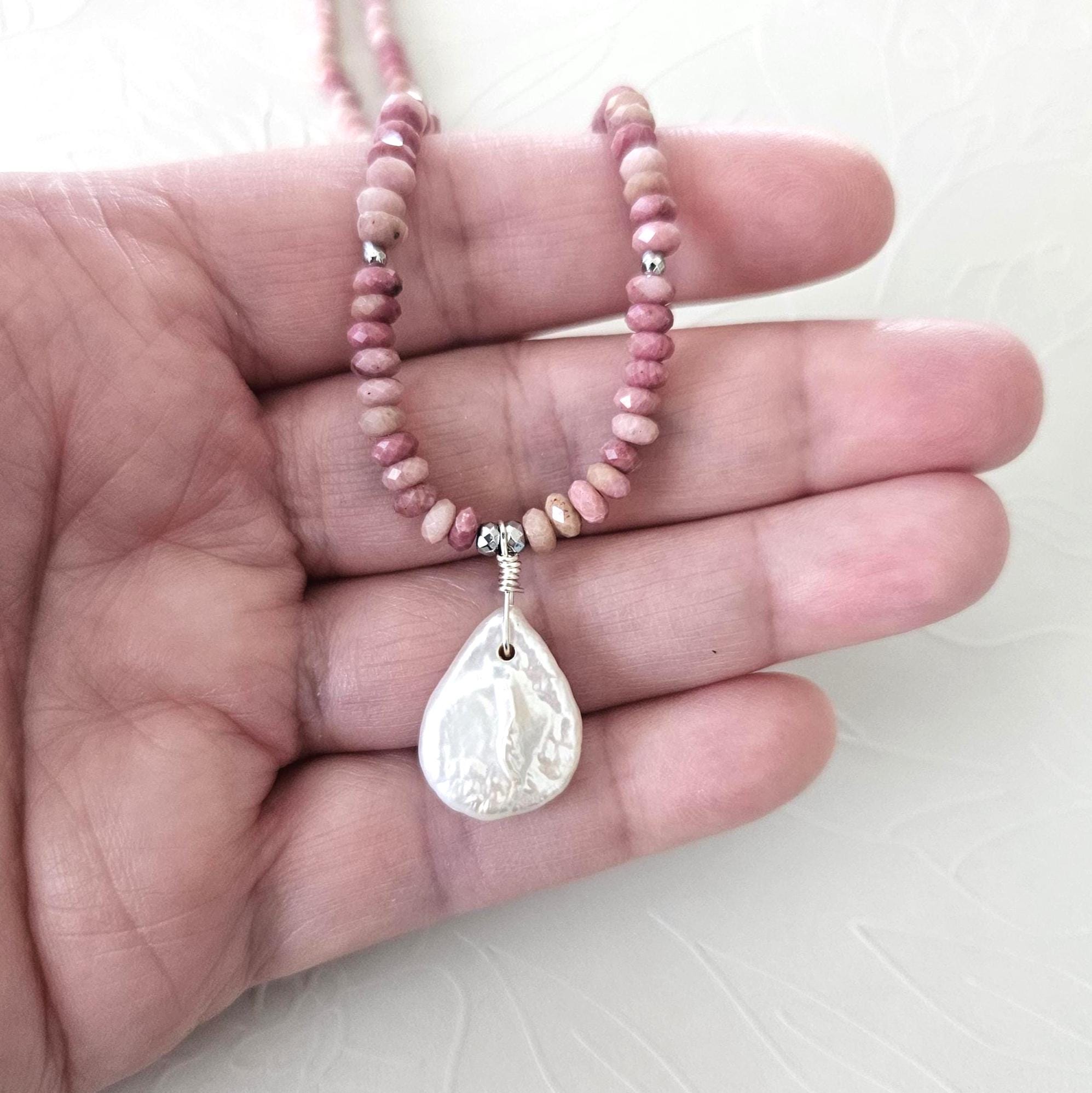 • * • Pink Rhodonite & White Coin Pearl Pendant Necklace 🩷• * •
