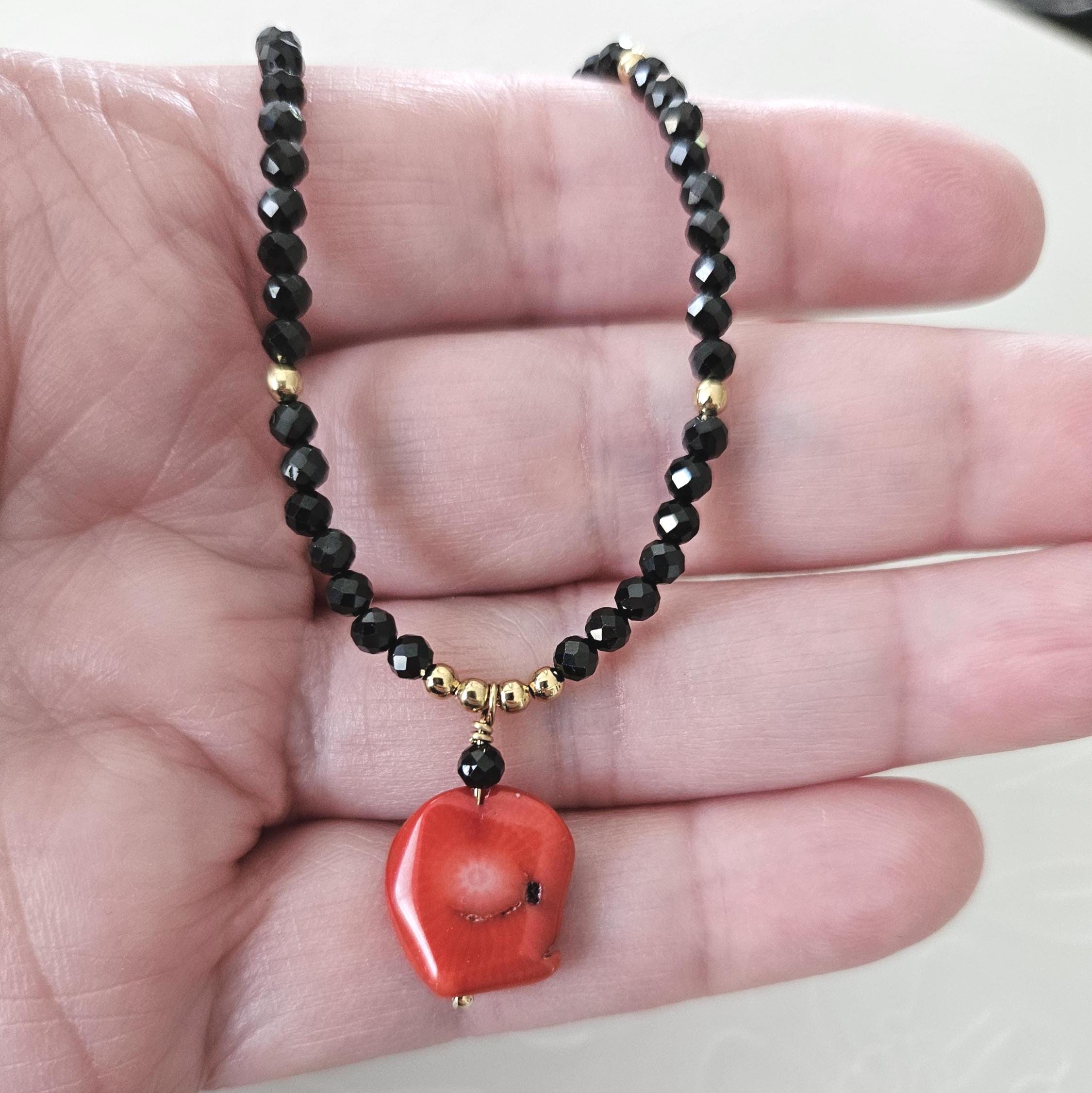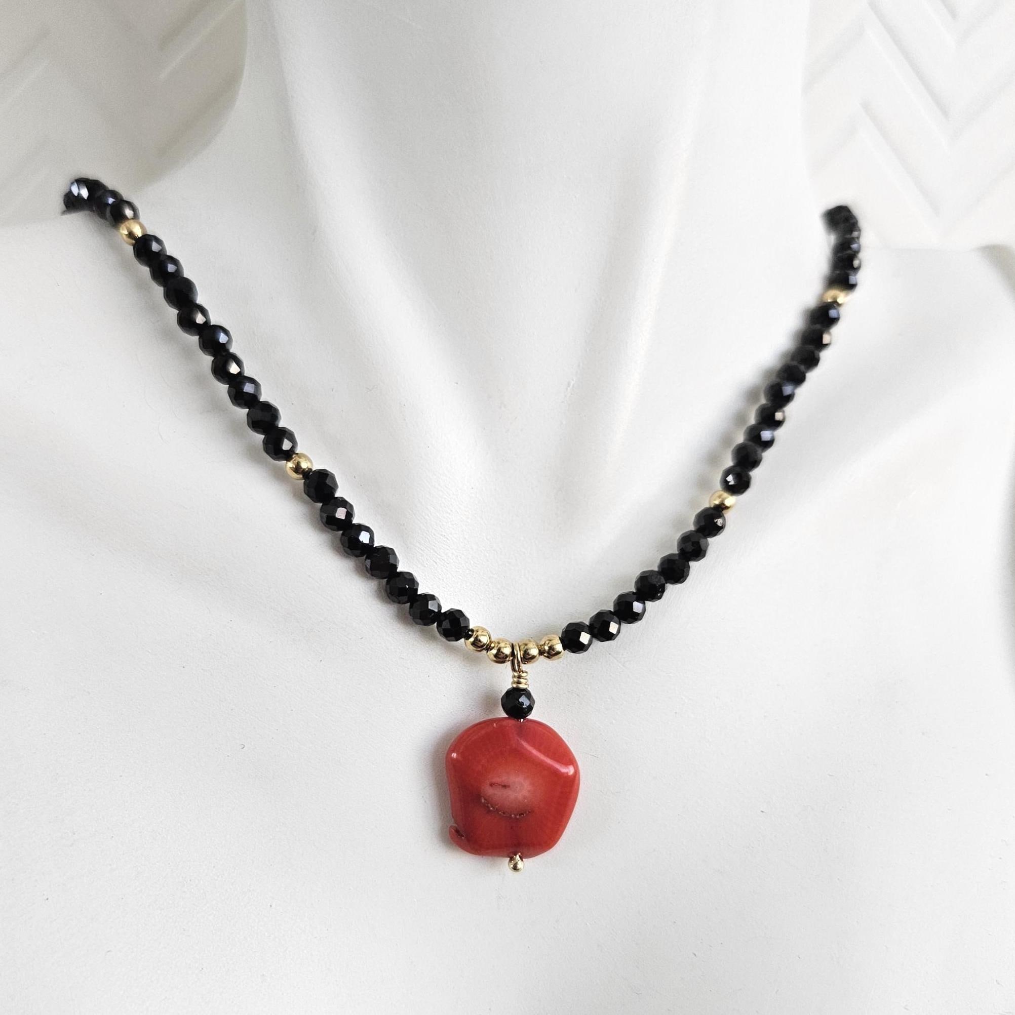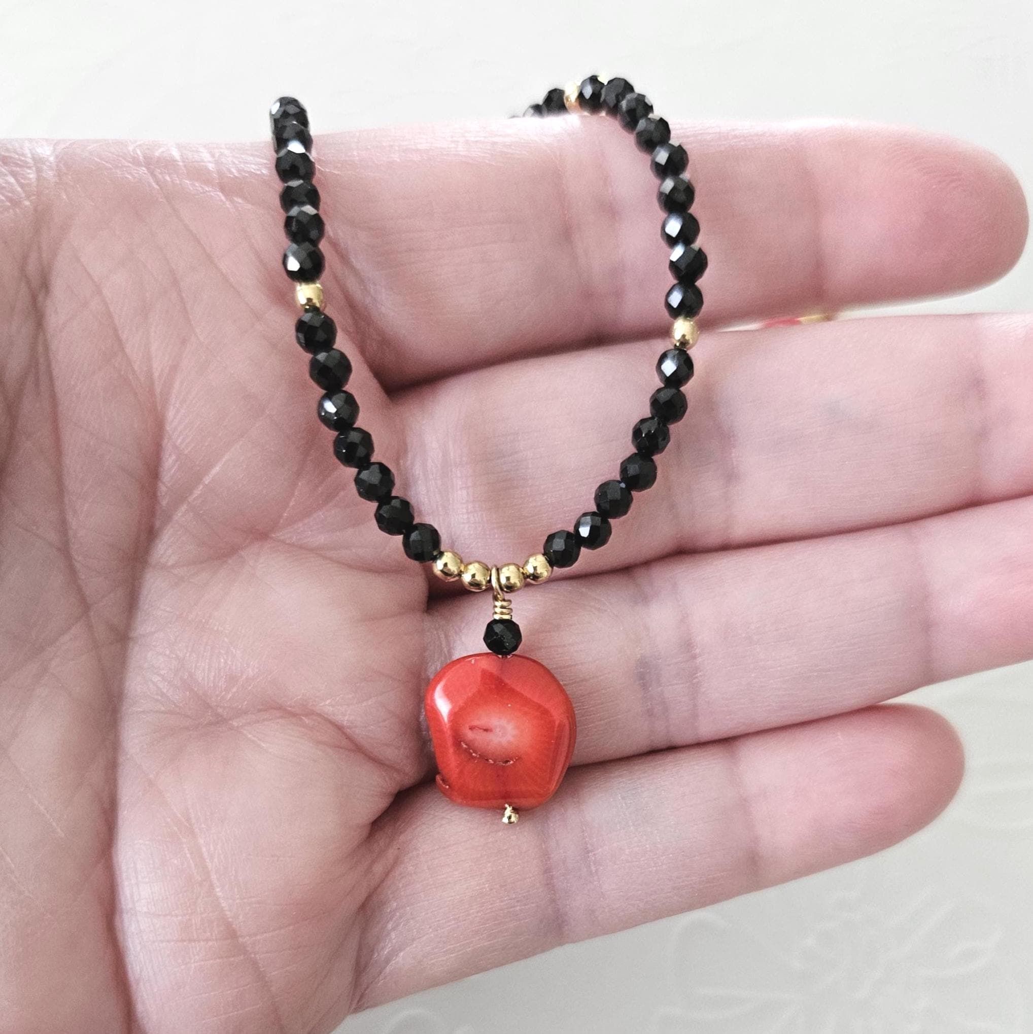 • • Coral Pendant & Black Spinel Beaded Necklace • •