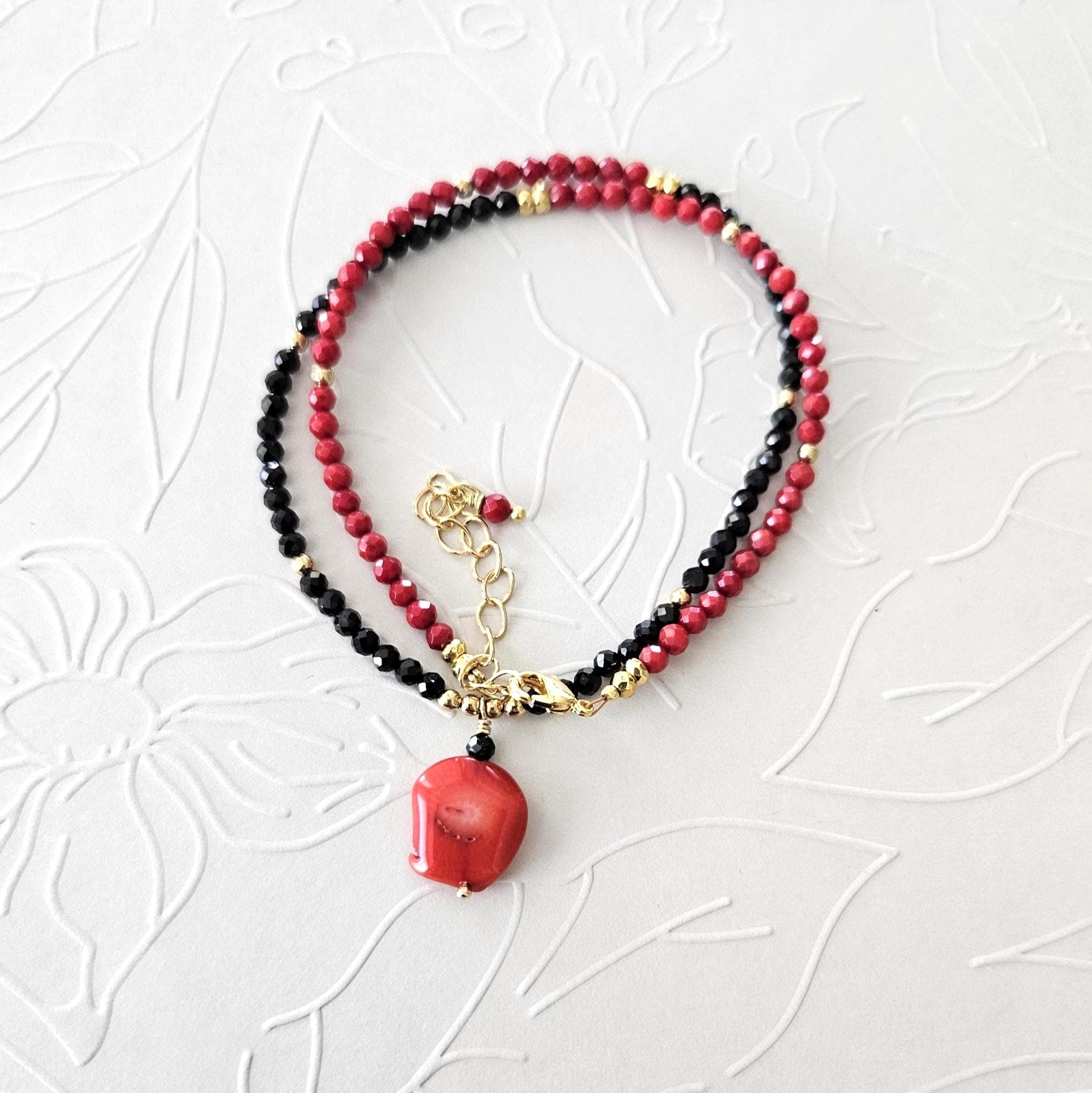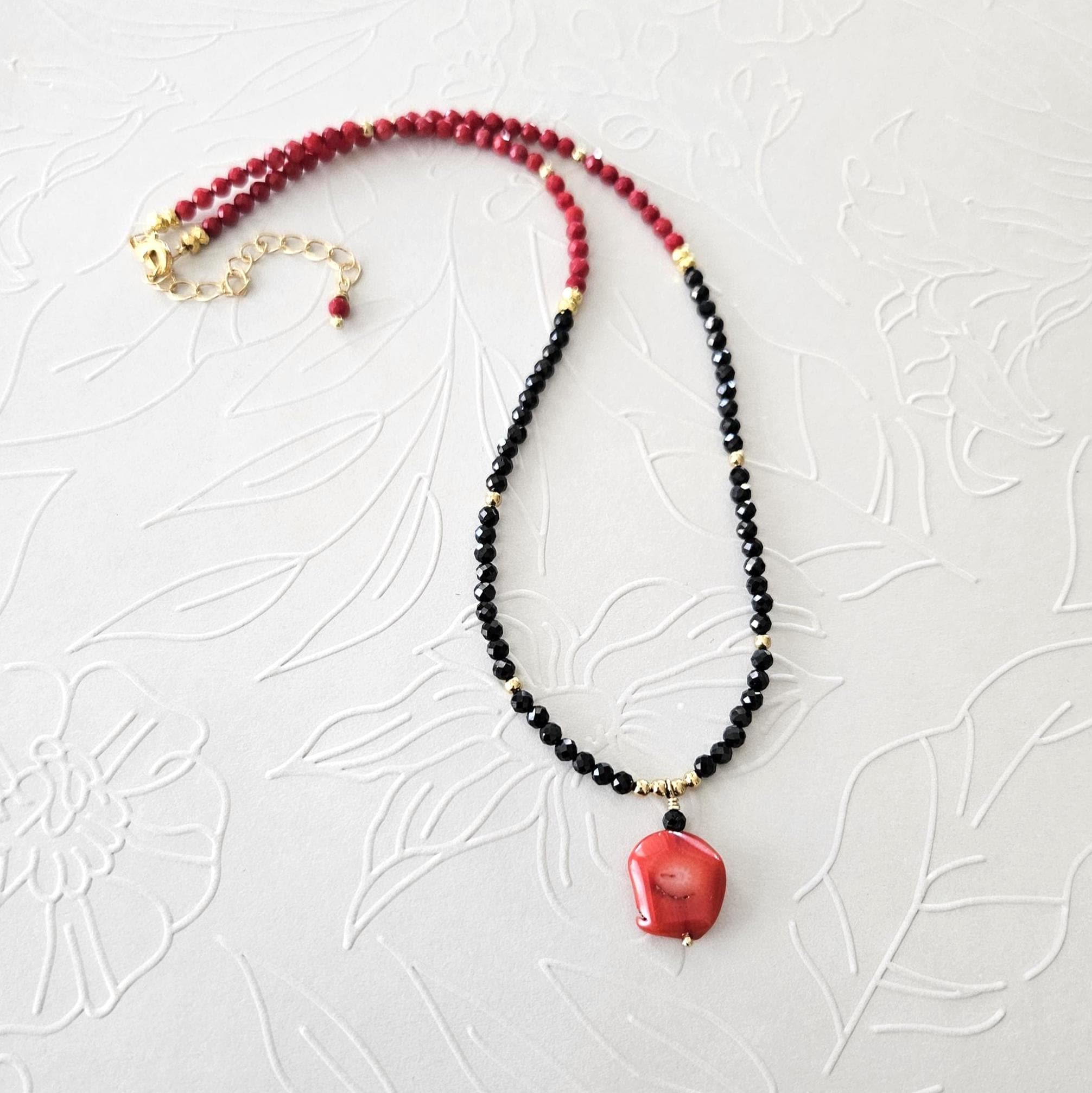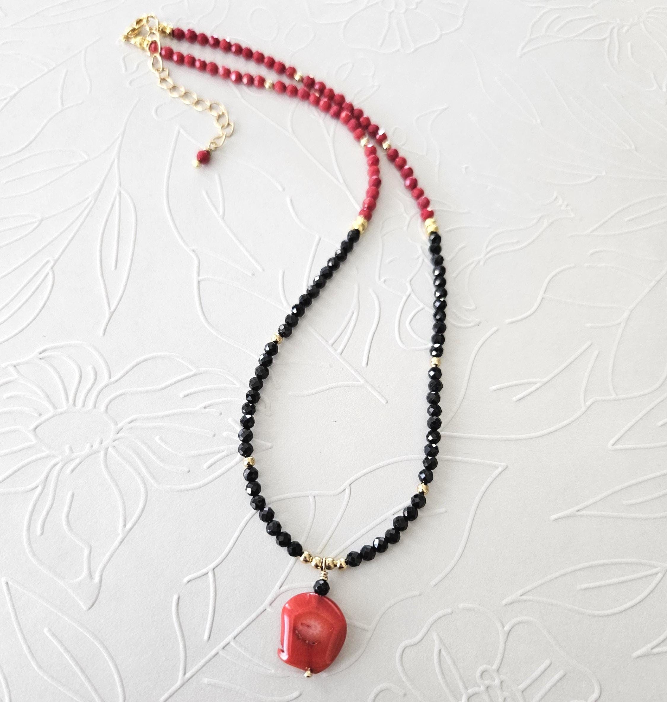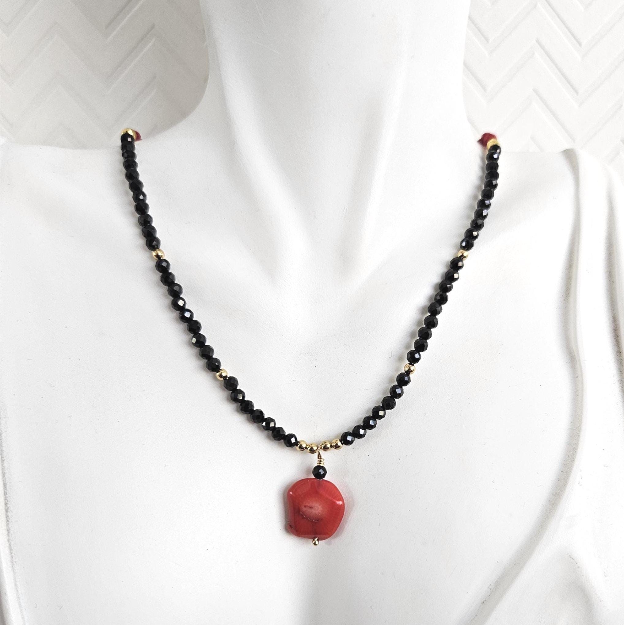 • • Coral Pendant & Black Spinel Beaded Necklace • •