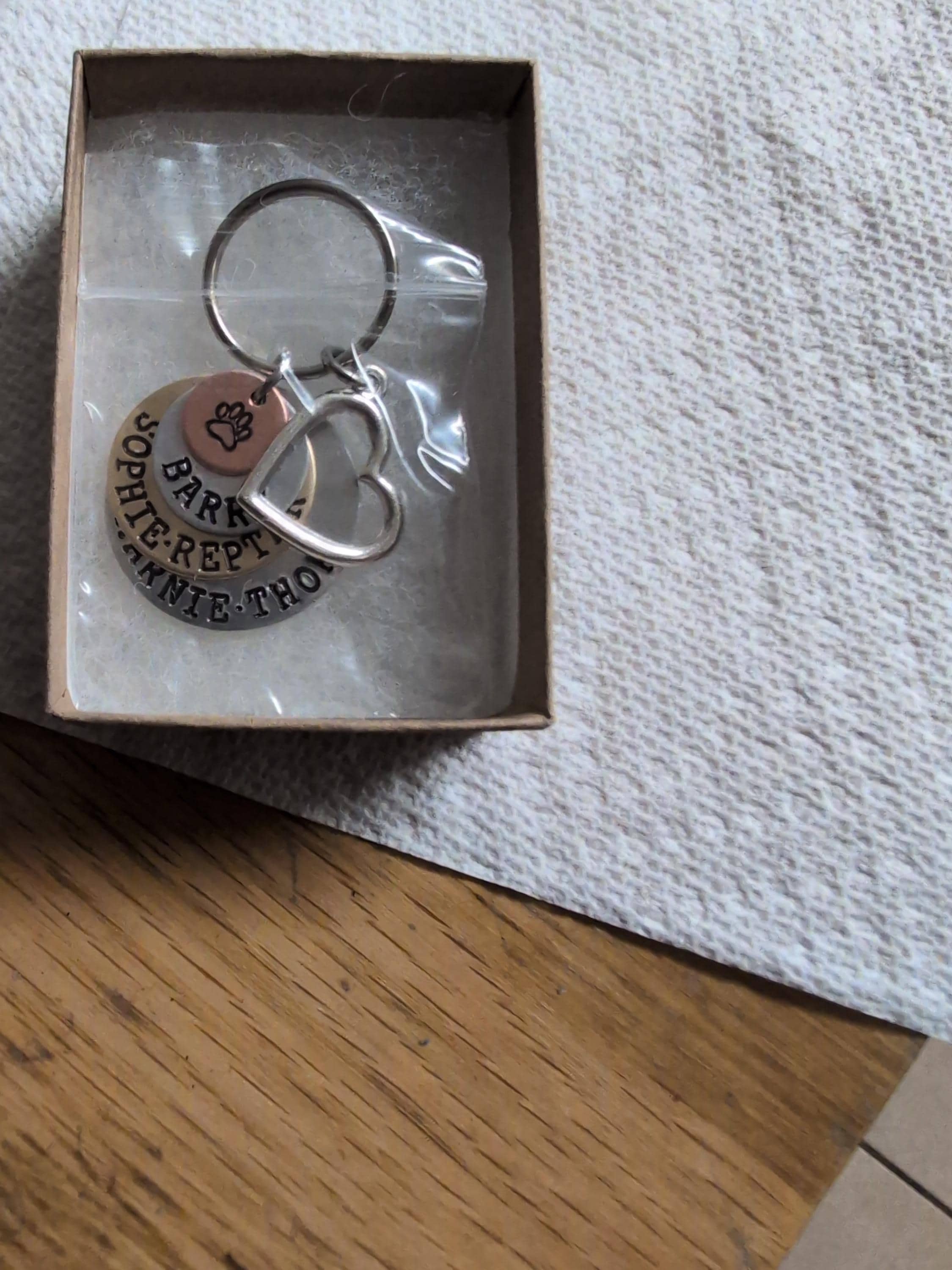 Wow!!! I opened the box, saw the keychain with my current pup’s name engraved as well as those of all of my pup’s and kitties from the past, and shed some tears. It’s so beautiful, and the shop owner and artist, Diana, was so helpful in working with me to get exactly what I wanted. To top it off, Diana donated some of the proceeds to one of my favorite animal rescues. I cannot even express how much I love and will always treasure this beautiful keychain. Thank you Diana!!